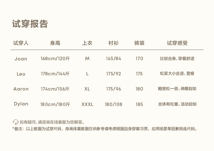 China (cm) 160-165/84-86 165-170 / 88-90 167-172 / 92-96 168-173 / 98-102 170-176 / 106-110