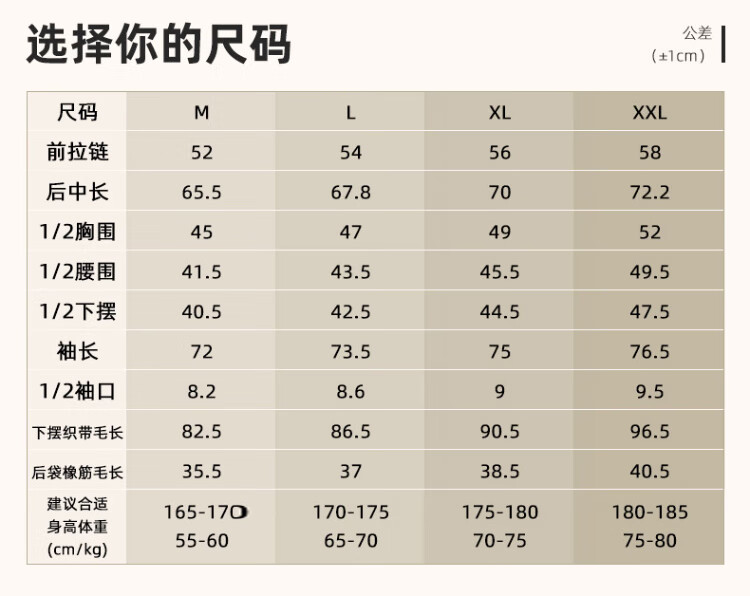 China (cm) 165 / 88-90 170 / 96-98 175 / 108-110 180 / 118-122 185 / 126-130