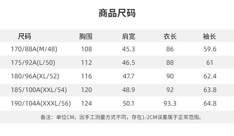 China (cm) 165 / 88-90 170 / 96-98 175 / 108-110 180 / 118-122 185 / 126-130