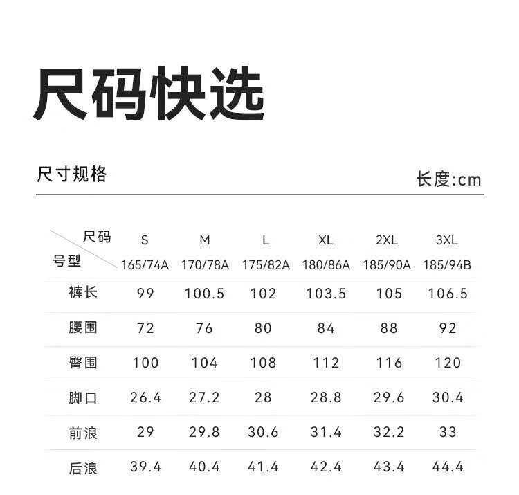 Outseam (cm) 99 cm 101.5 cm 104 cm 106.5 cm 109 cm