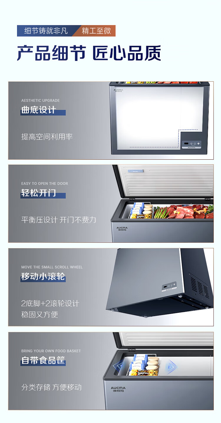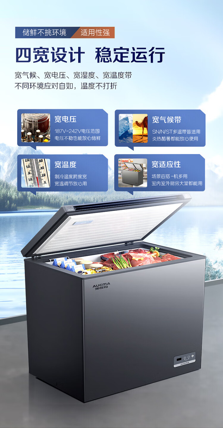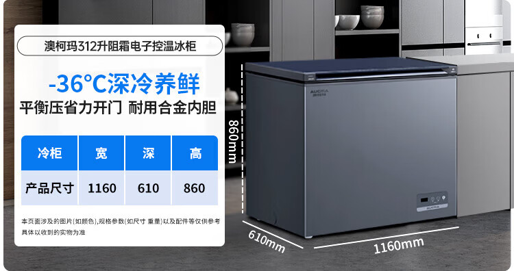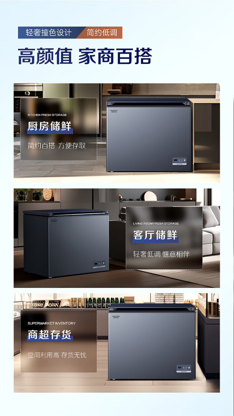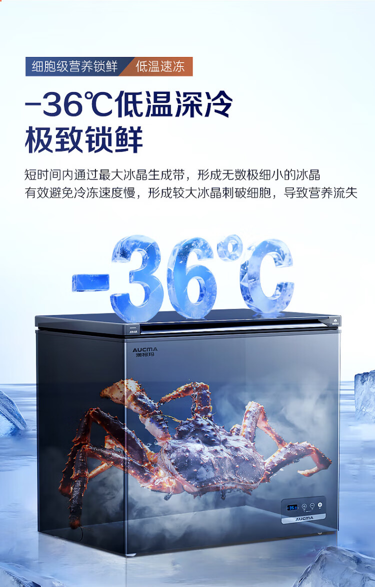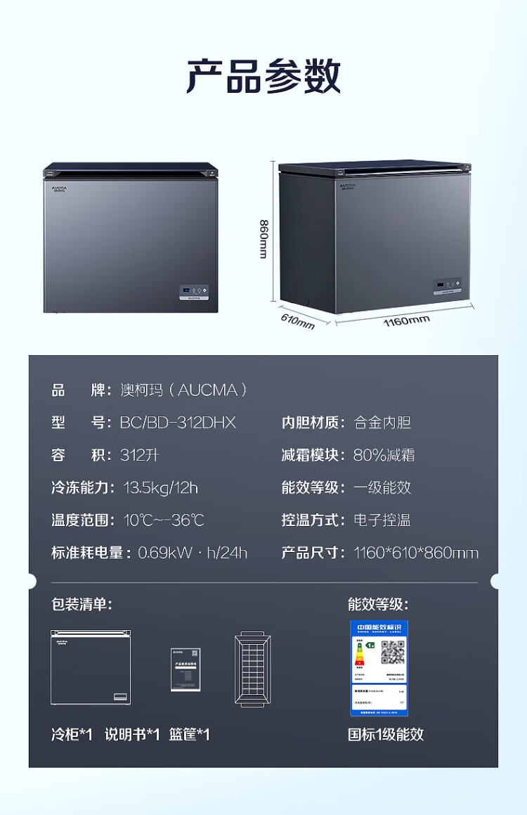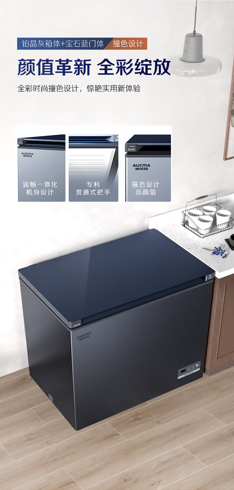 AUCMA 312-liter household frost-reducing freezer, large-capacity commercial refrigerator-freezer, ultra-low temperature electronically controlled horizontal refrigerator, first-class energy efficiency, Lanqing series BC/BD-312DHX
