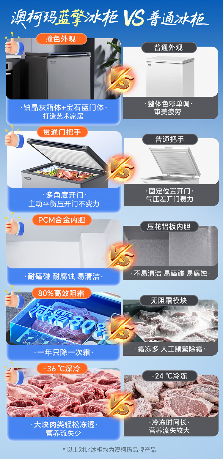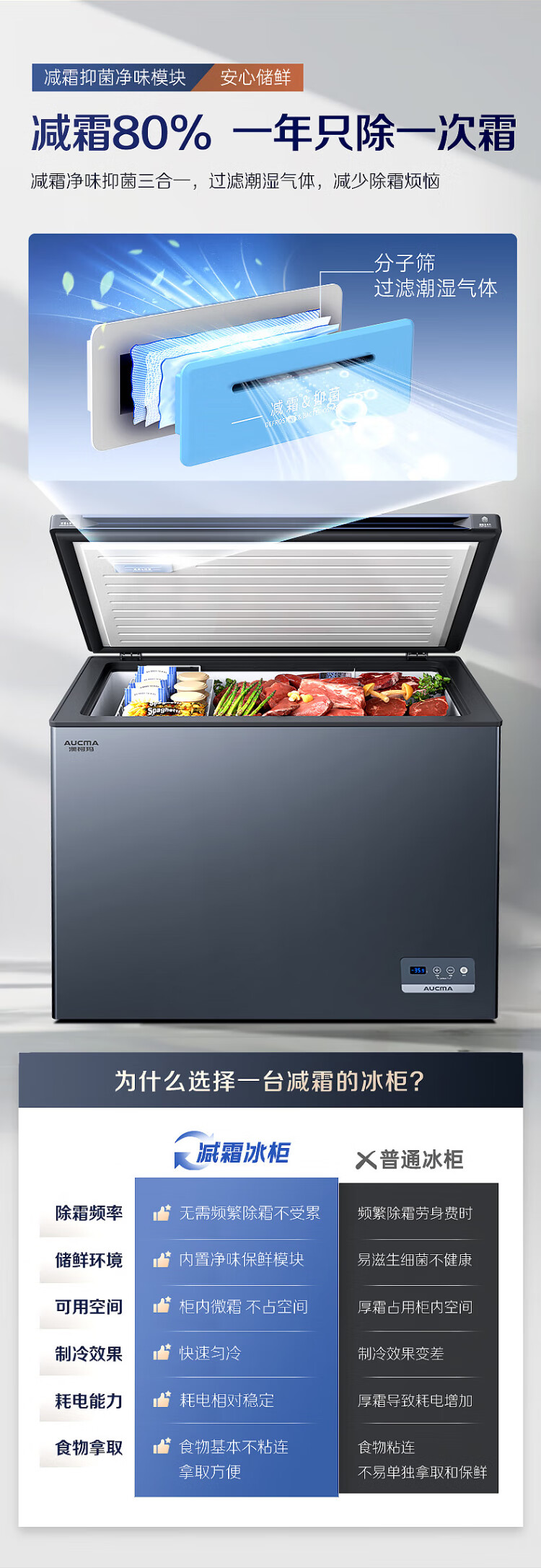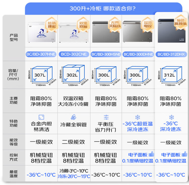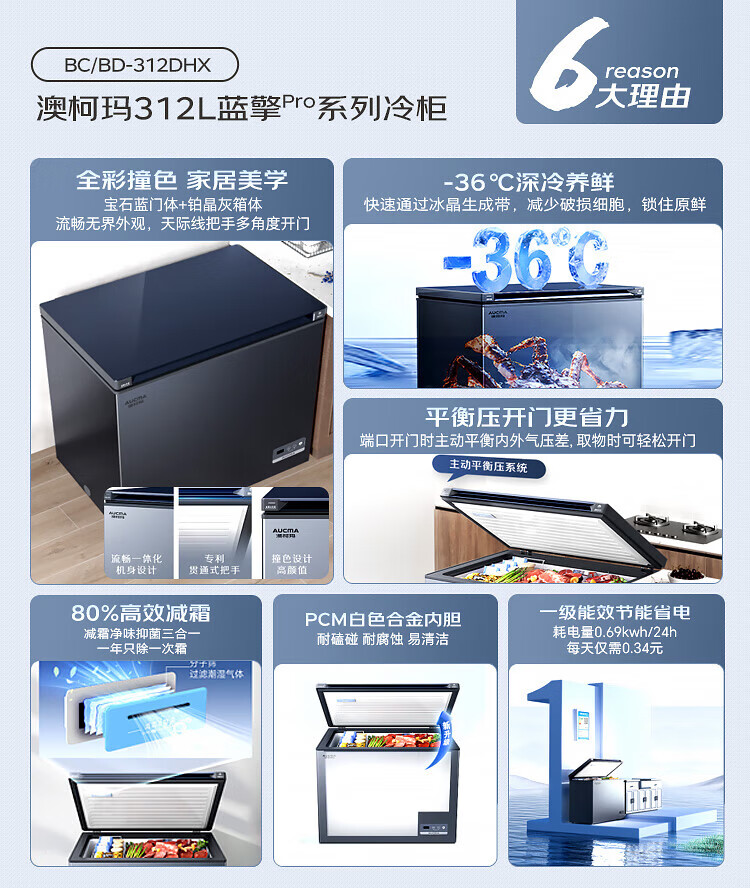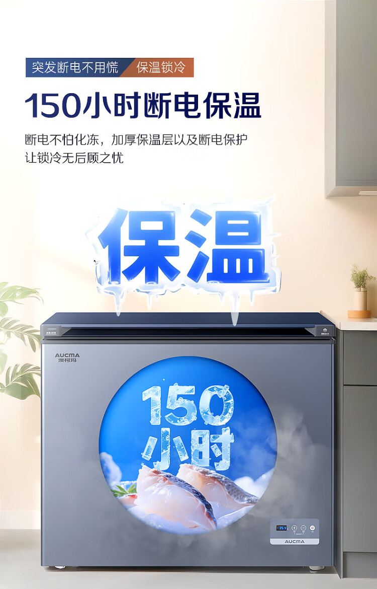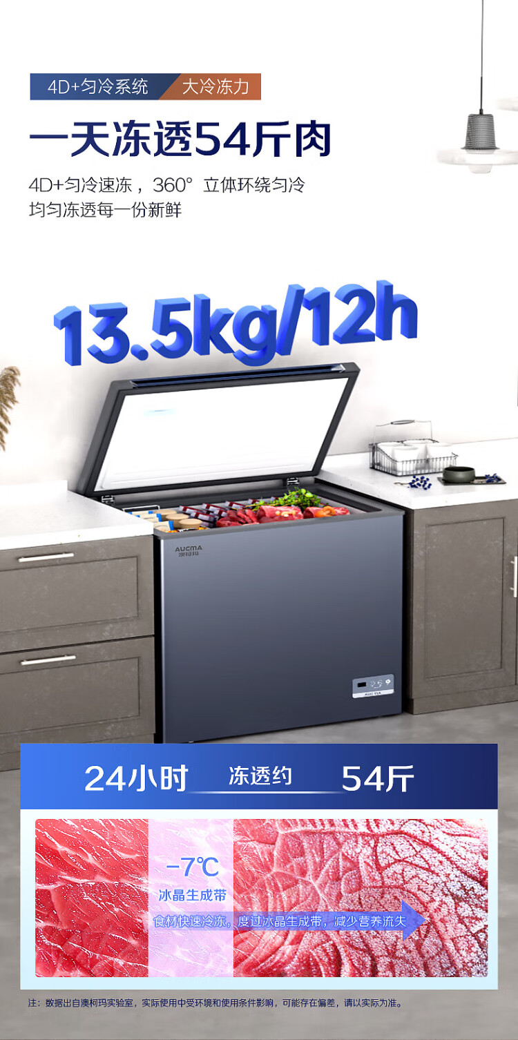 AUCMA 312-liter household frost-reducing freezer, large-capacity commercial refrigerator-freezer, ultra-low temperature electronically controlled horizontal refrigerator, first-class energy efficiency, Lanqing series BC/BD-312DHX