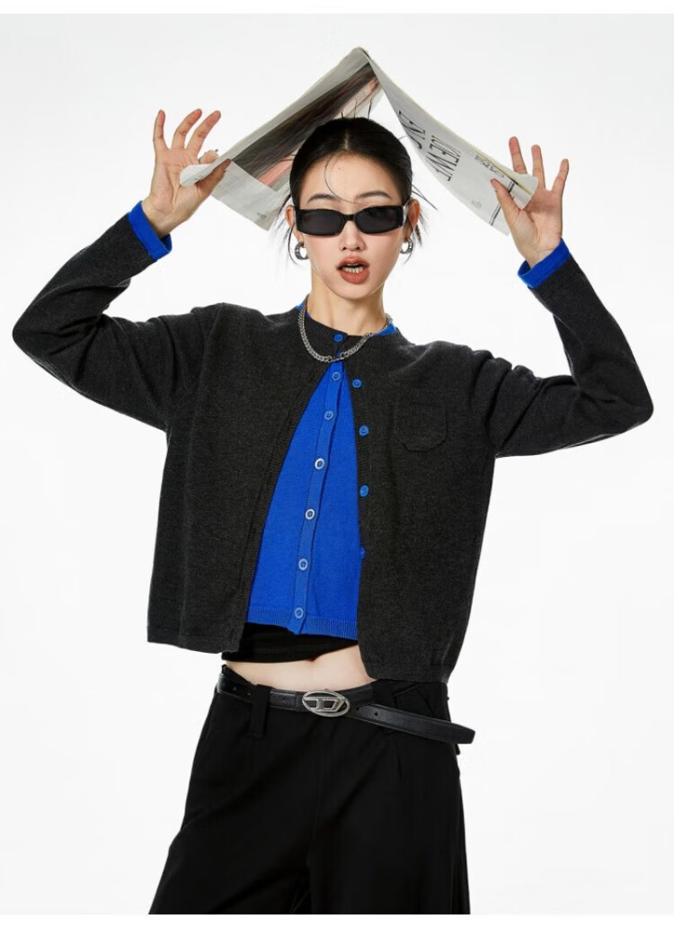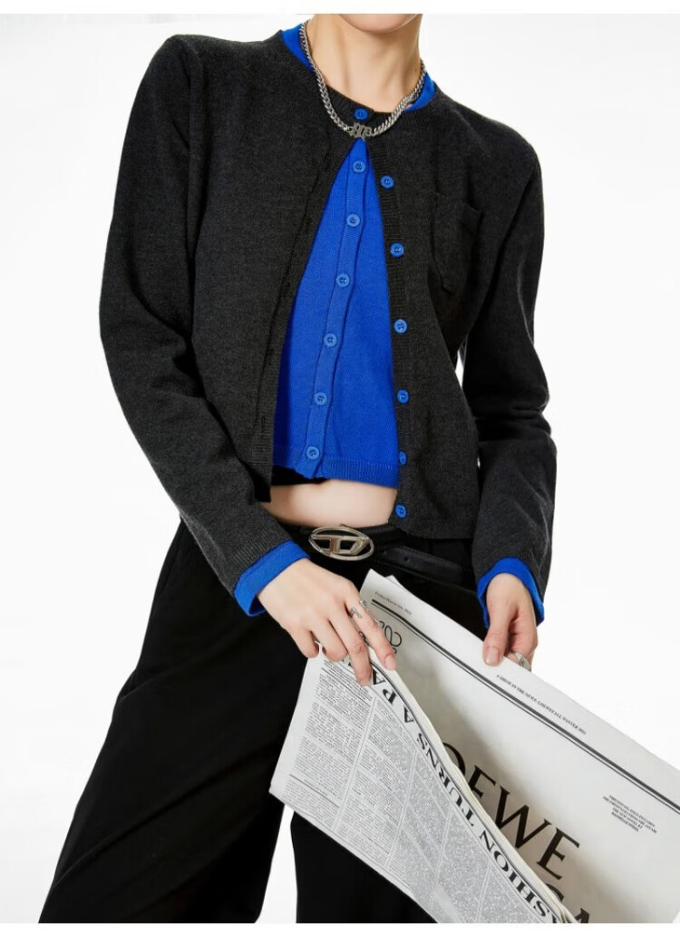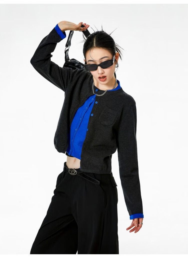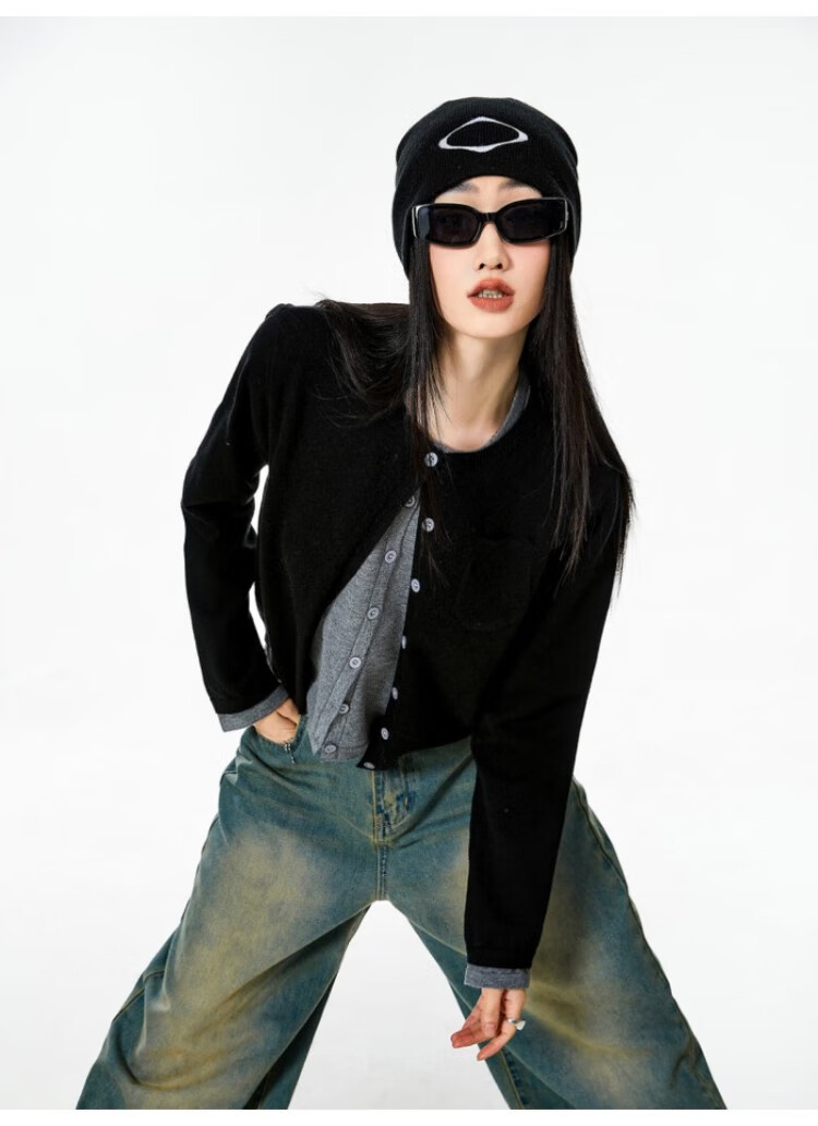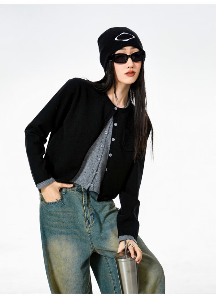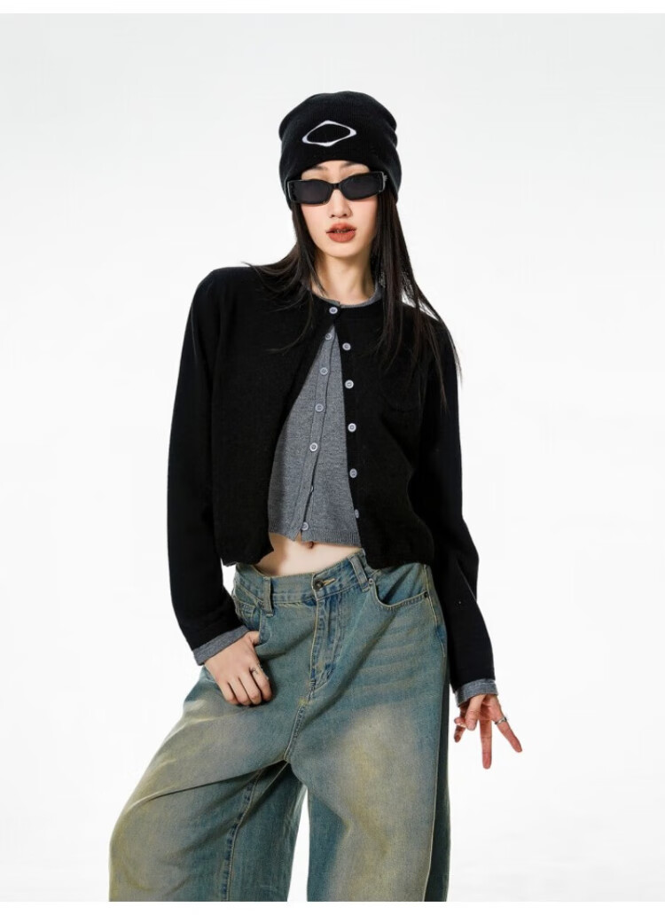 ICH MODE American retro fake two-piece knitted cardigan women's autumn and winter sweater jacket bottoming shirt long-sleeved top dark gray M