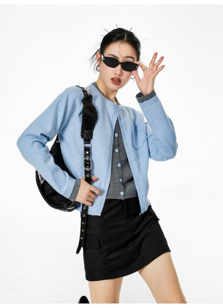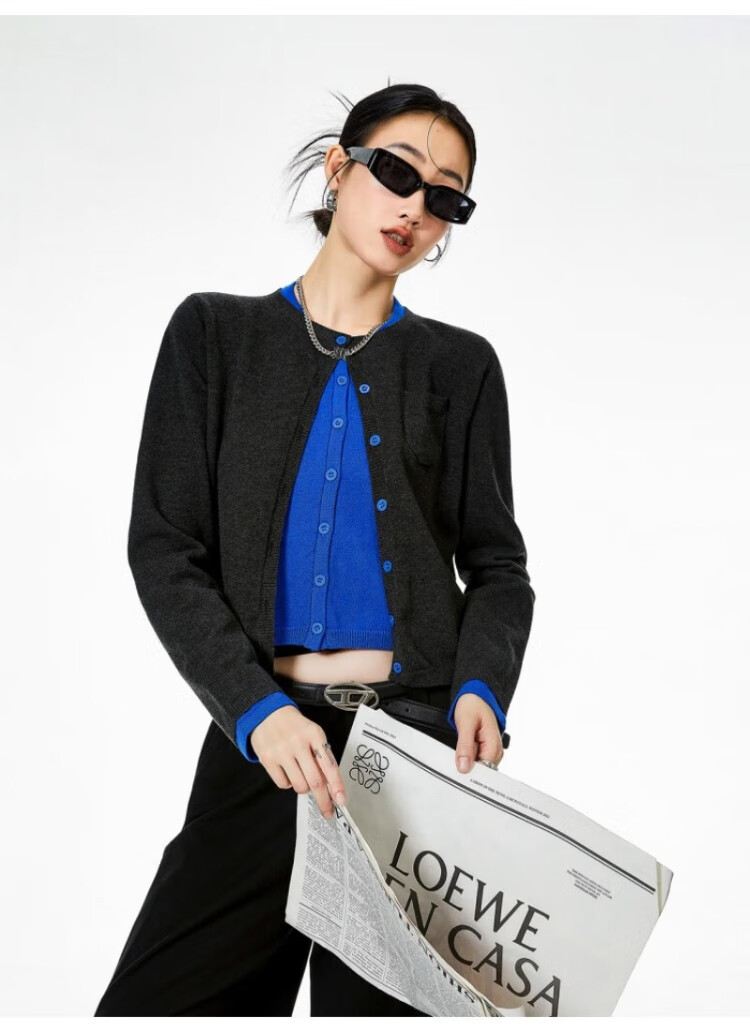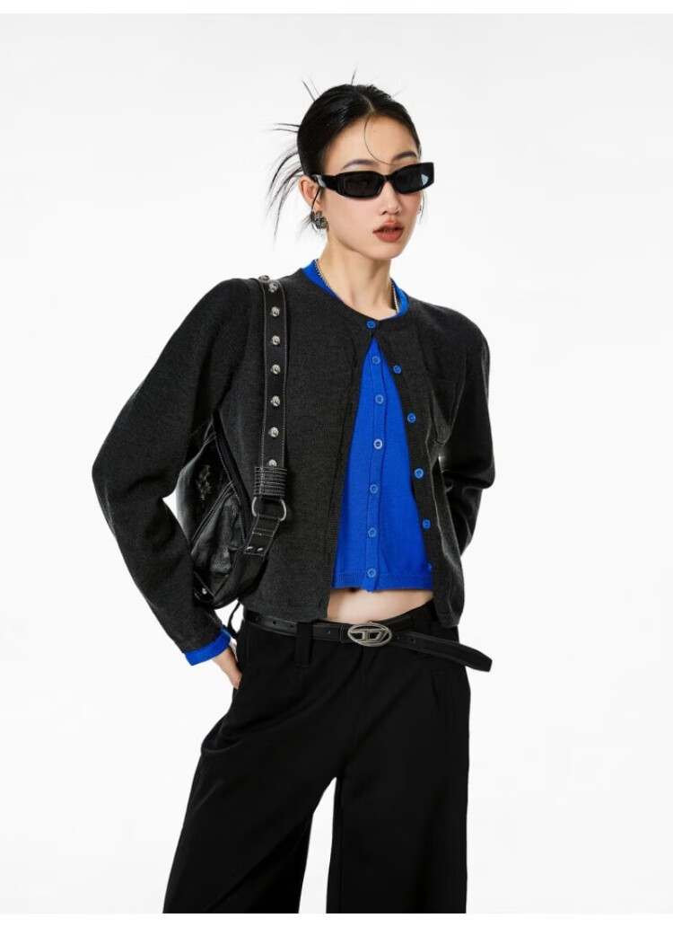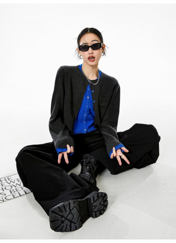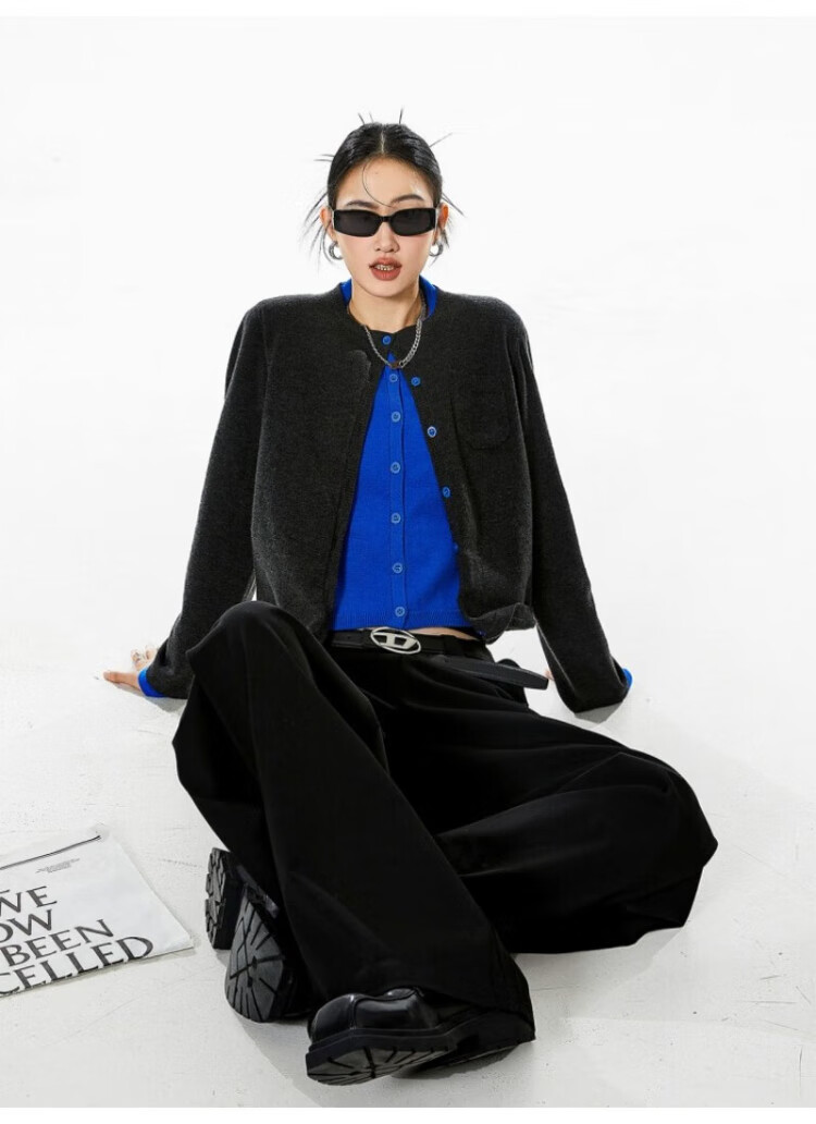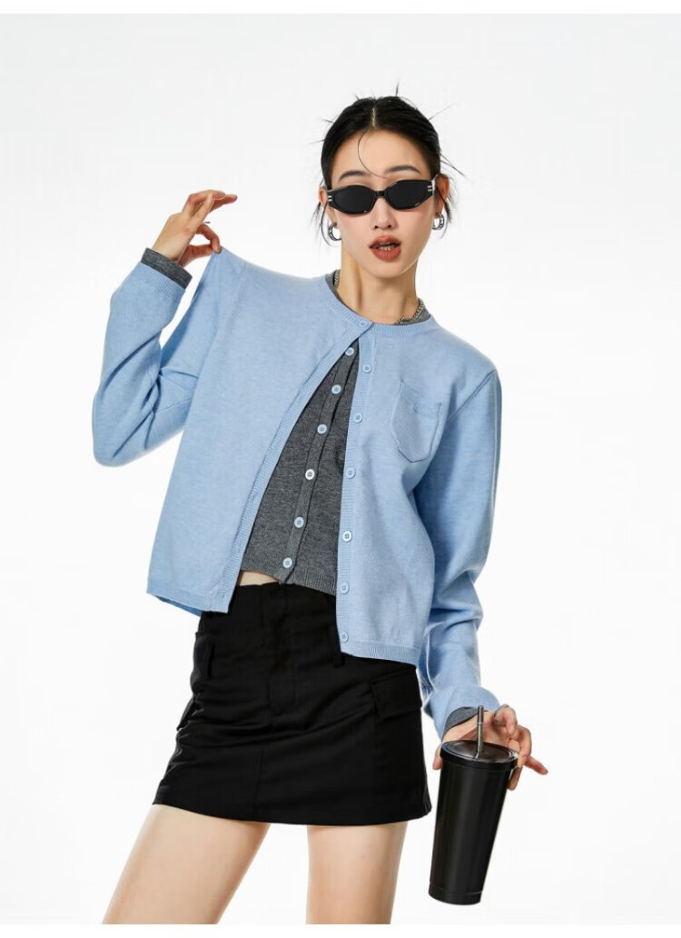 ICH MODE American retro fake two-piece knitted cardigan women's autumn and winter sweater jacket bottoming shirt long-sleeved top dark gray M