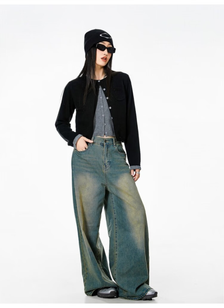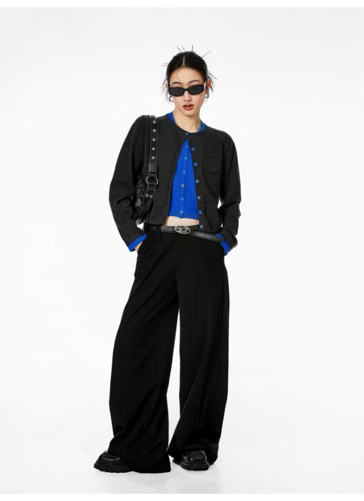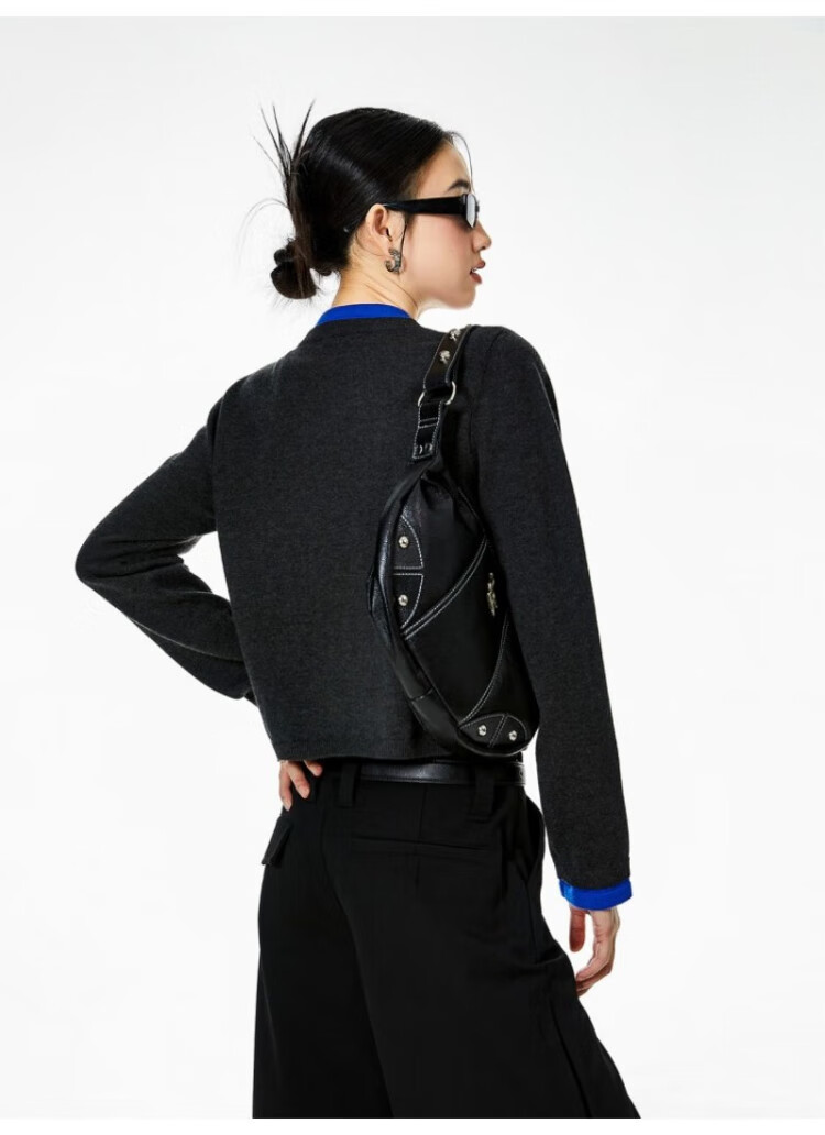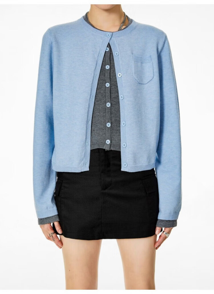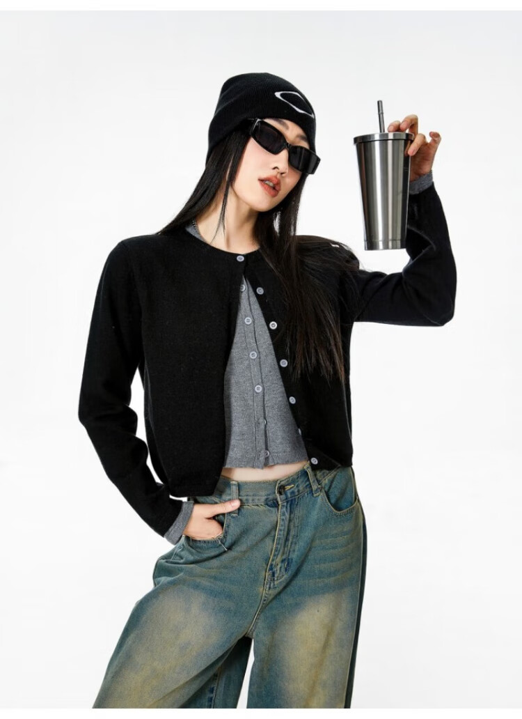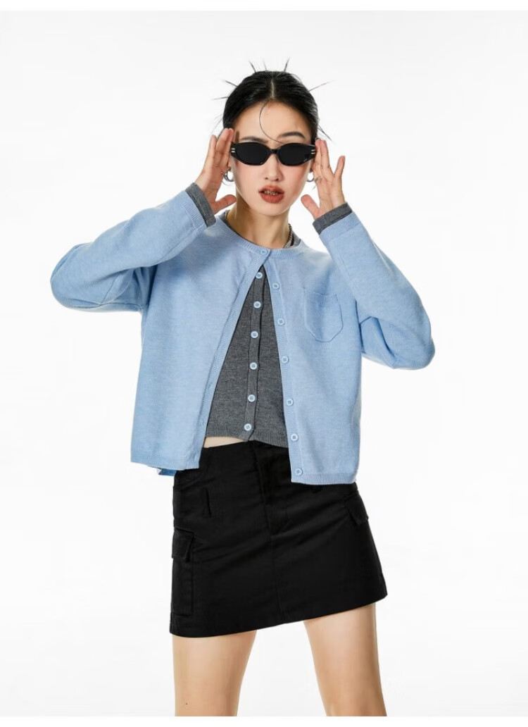 ICH MODE American retro fake two-piece knitted cardigan women's autumn and winter sweater jacket bottoming shirt long-sleeved top dark gray M