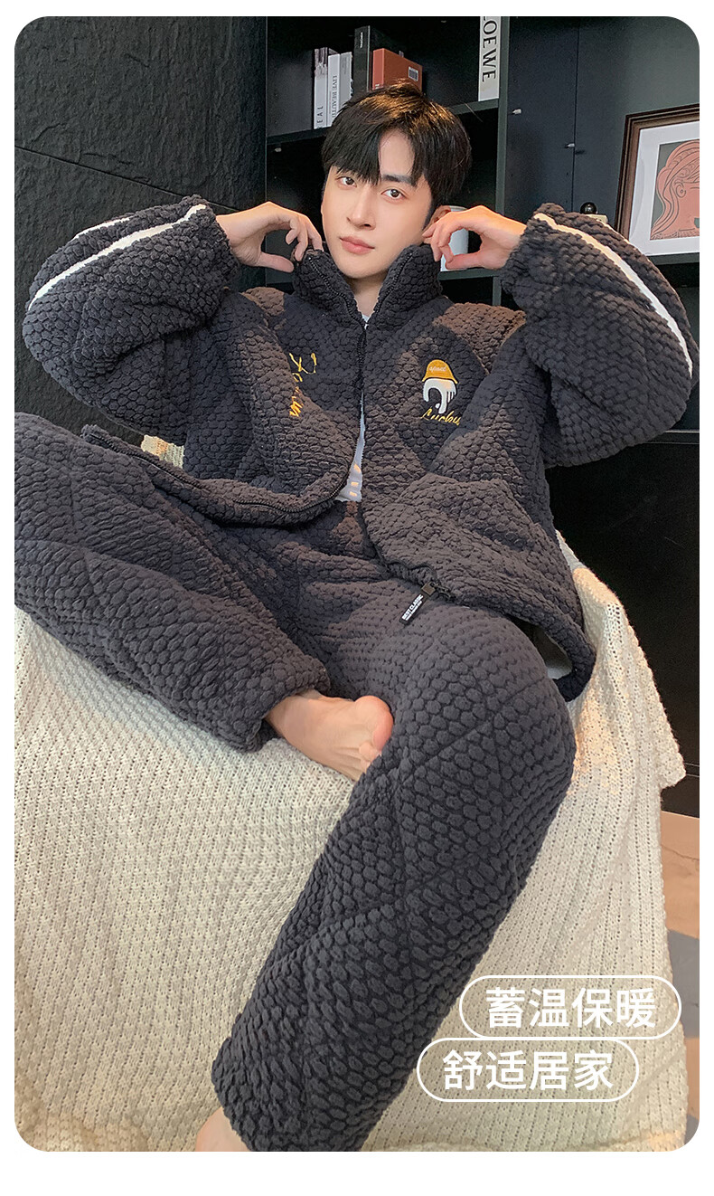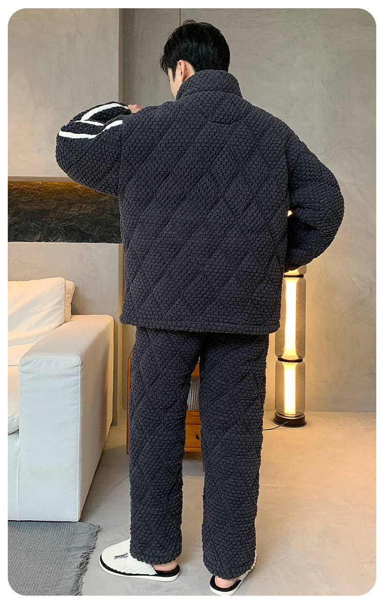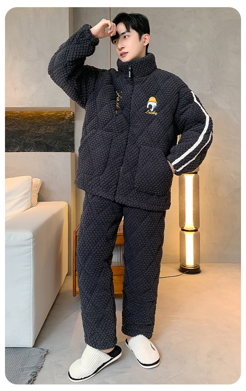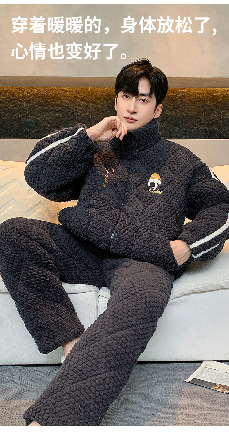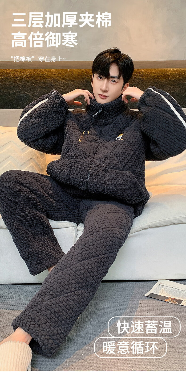 Langsha pajamas men's winter thickened plus velvet three-layer quilted warm home clothing outer wear large size suit