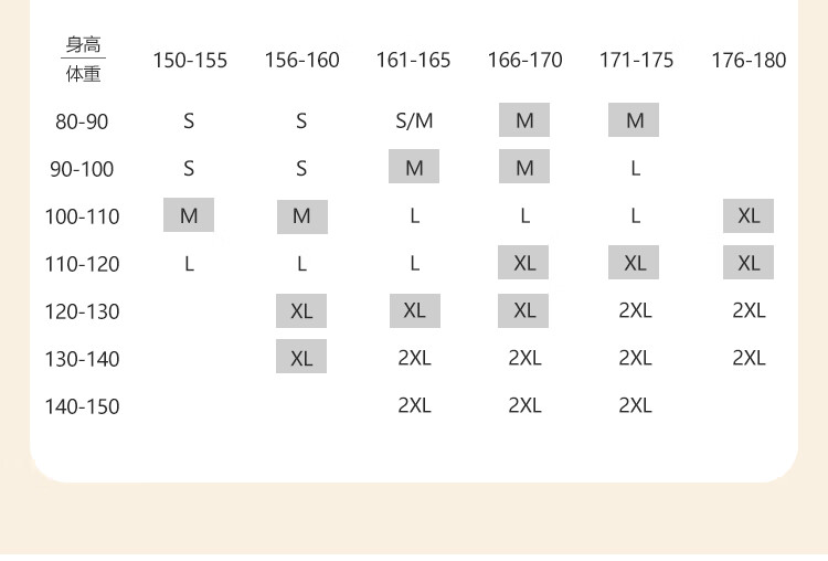 China (cm) 160-165/84-86 165-170 / 88-90 167-172 / 92-96 168-173 / 98-102 170-176 / 106-110