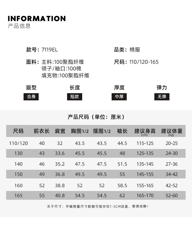 China (cm) 165 / 88-90 170 / 96-98 175 / 108-110 180 / 118-122 185 / 126-130