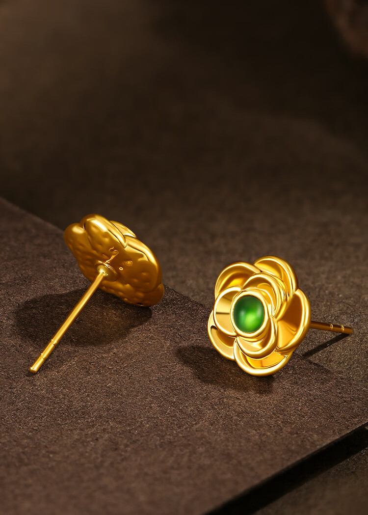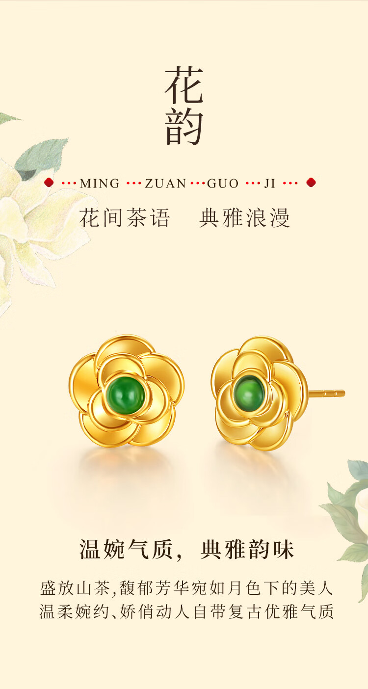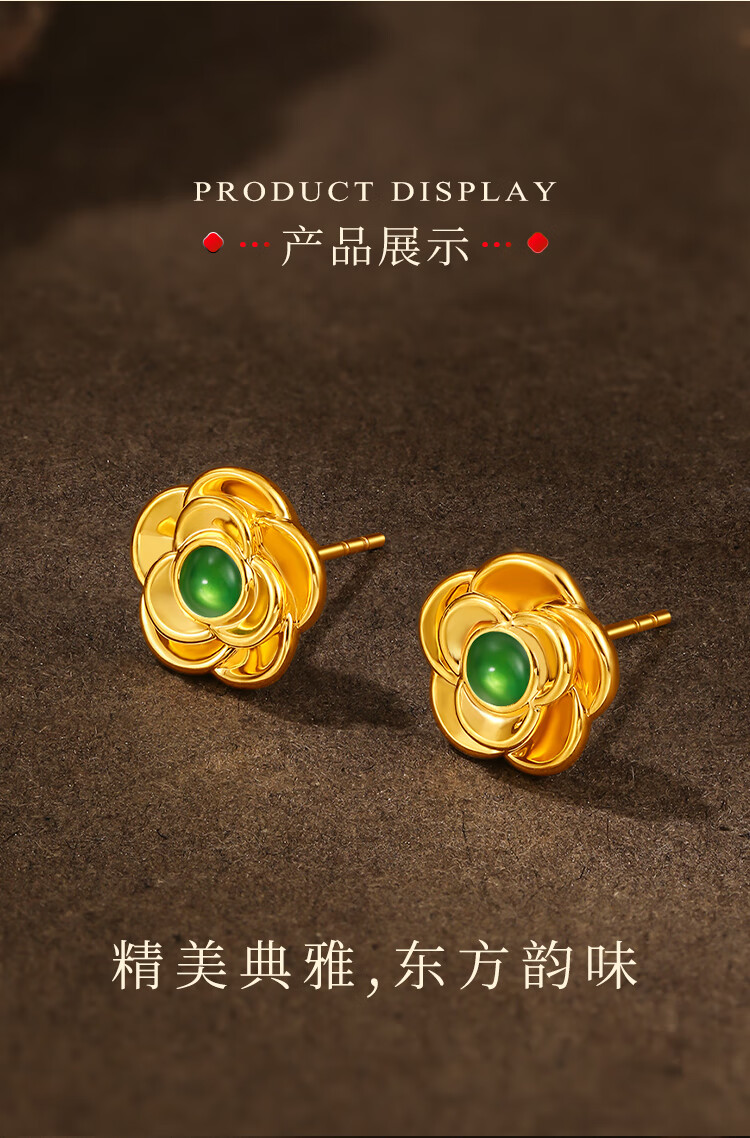 Ming Diamond International 18K Gold Jade Camellia Earrings Women's au750 Earrings Fashion Inlaid Earrings for Girlfriend's Birthday Gift