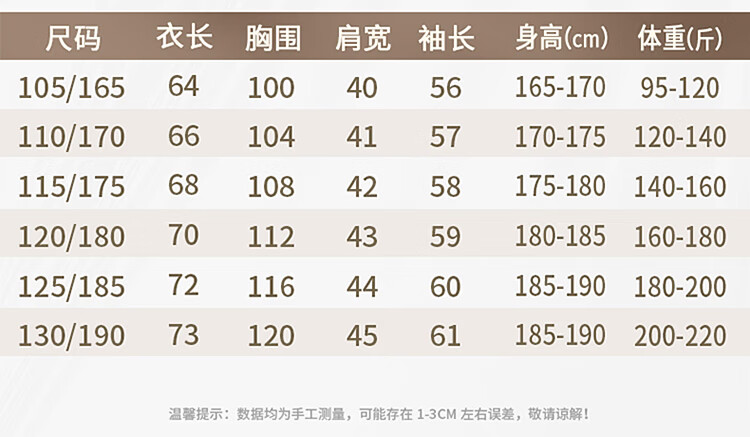 China (cm) 165 / 88-90 170 / 96-98 175 / 108-110 180 / 118-122 185 / 126-130