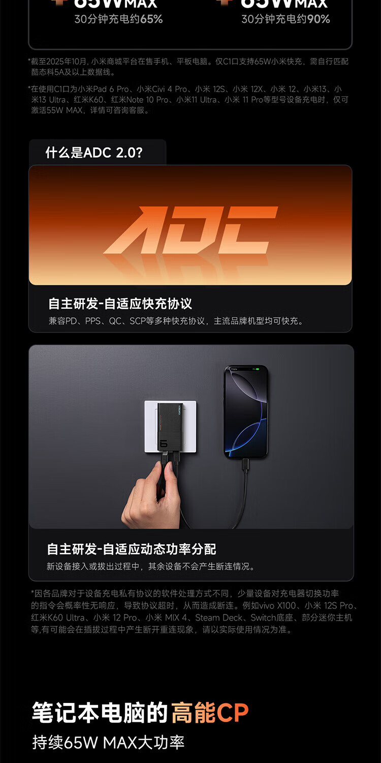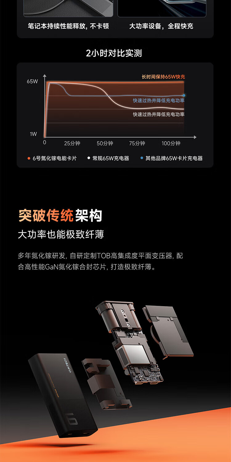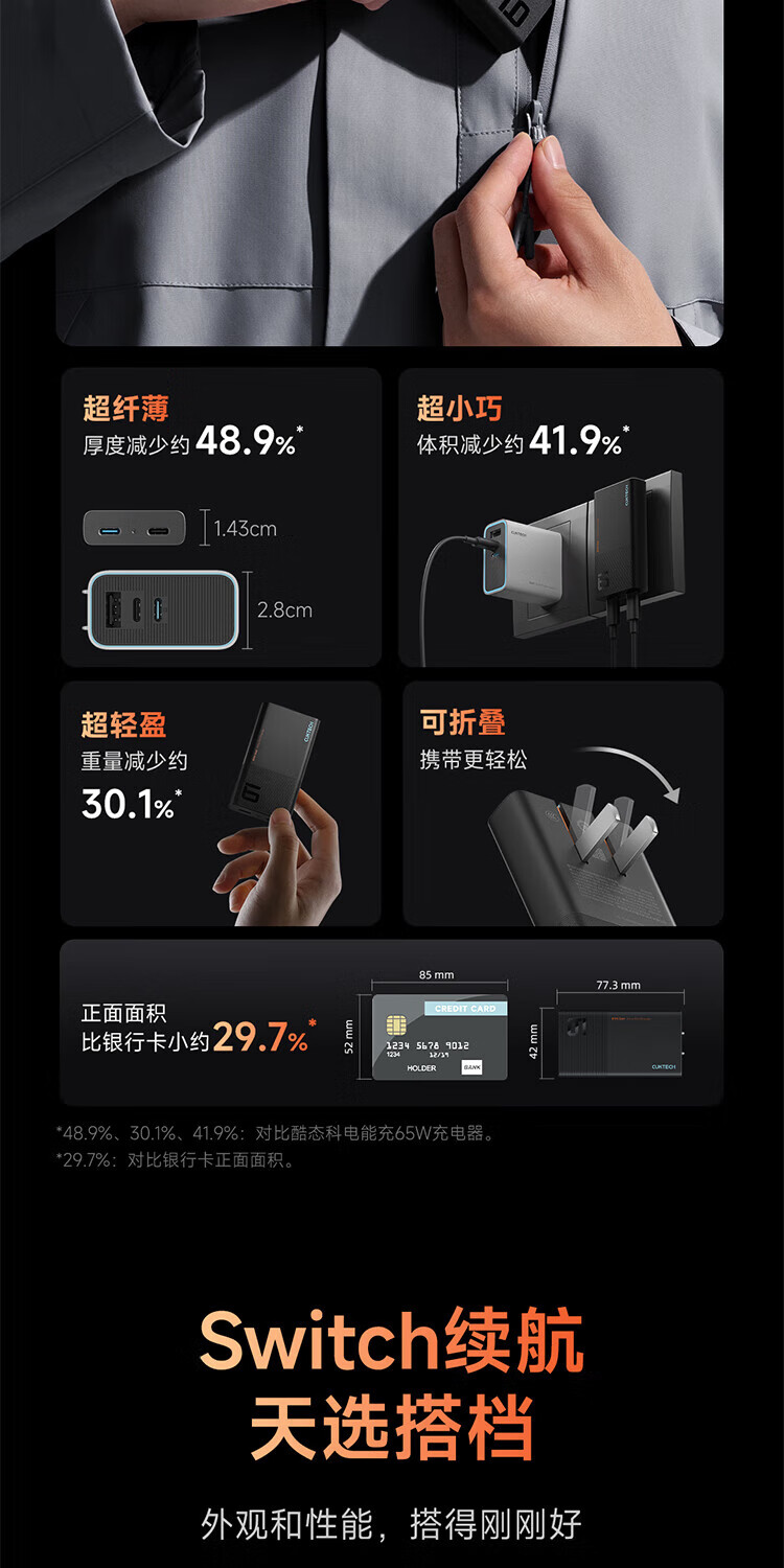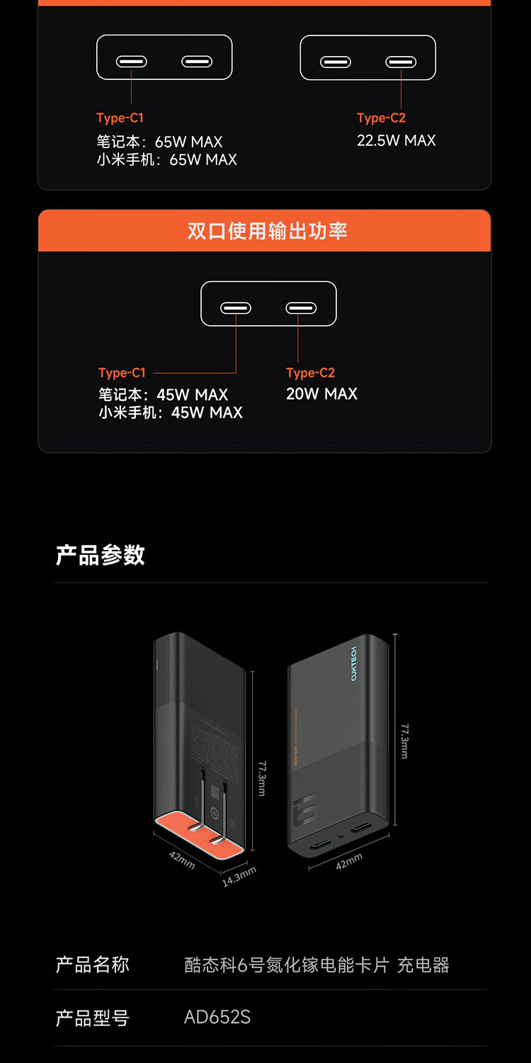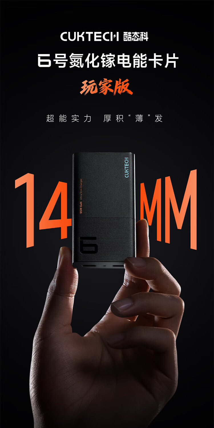 CUKTECH酷态科65W氮化镓充电器6号电能卡片玩家版超薄兼容PD45W苹果17/小米/华为手机笔记本/Switch多口