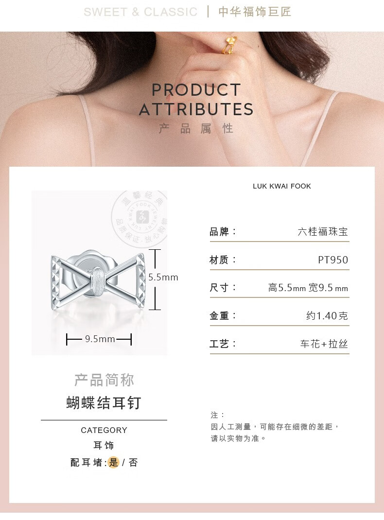 Liuguifu Jewelry Bow Earrings PT950 Platinum Earrings Earrings Earrings Women's E-commerce Special Birthday Gift 1.65g