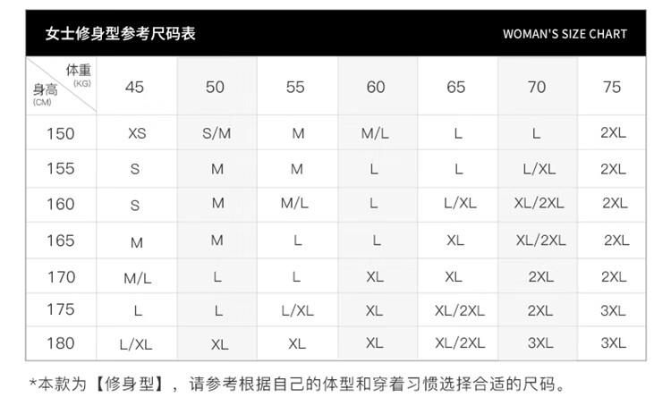 China (cm) 160-165/84-86 165-170 / 88-90 167-172 / 92-96 168-173 / 98-102 170-176 / 106-110