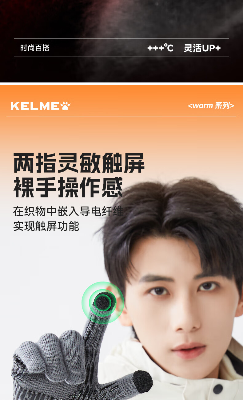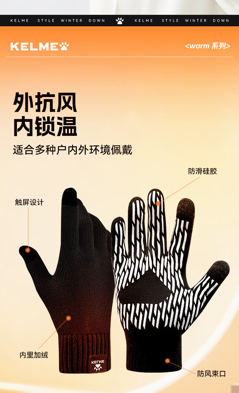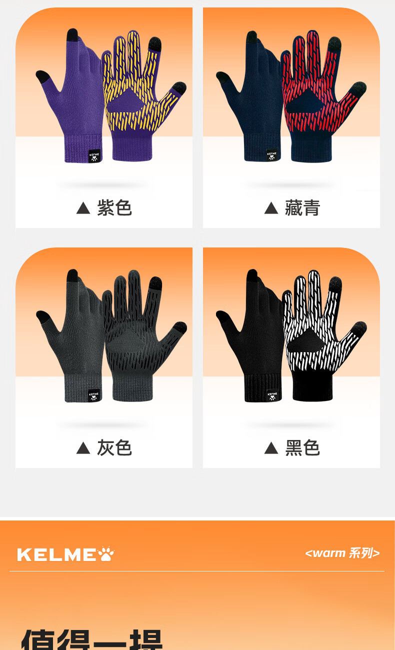 KELME gloves men's winter running warm gloves outdoor sports cycling anti-cold wind touch screen anti-slip knitted wool gloves