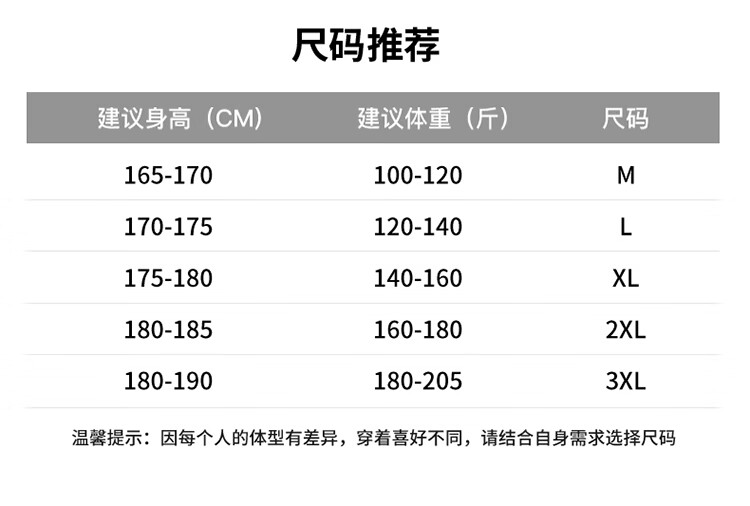 China (cm) 165 / 88-90 170 / 96-98 175 / 108-110 180 / 118-122 185 / 126-130