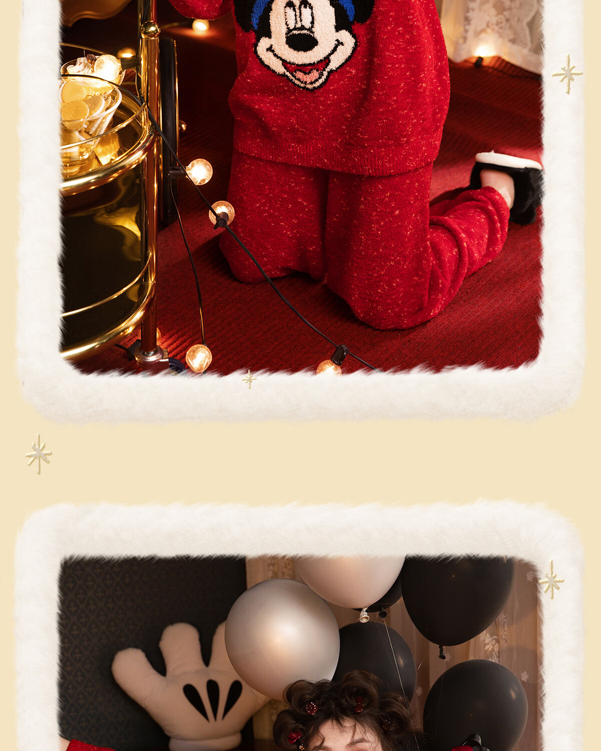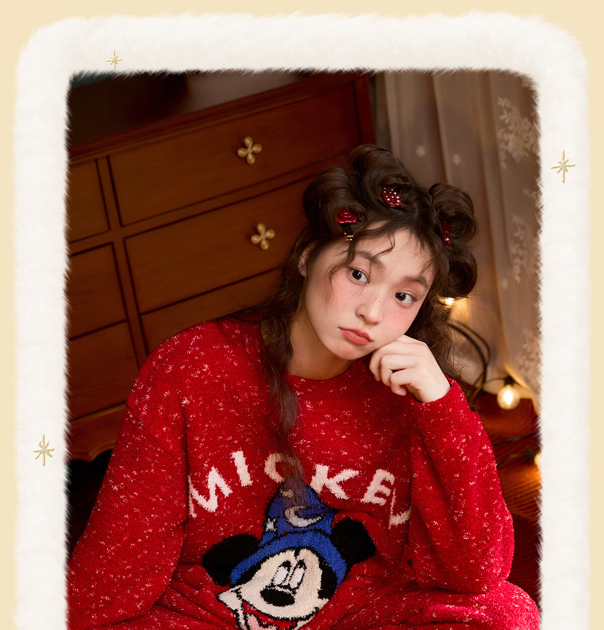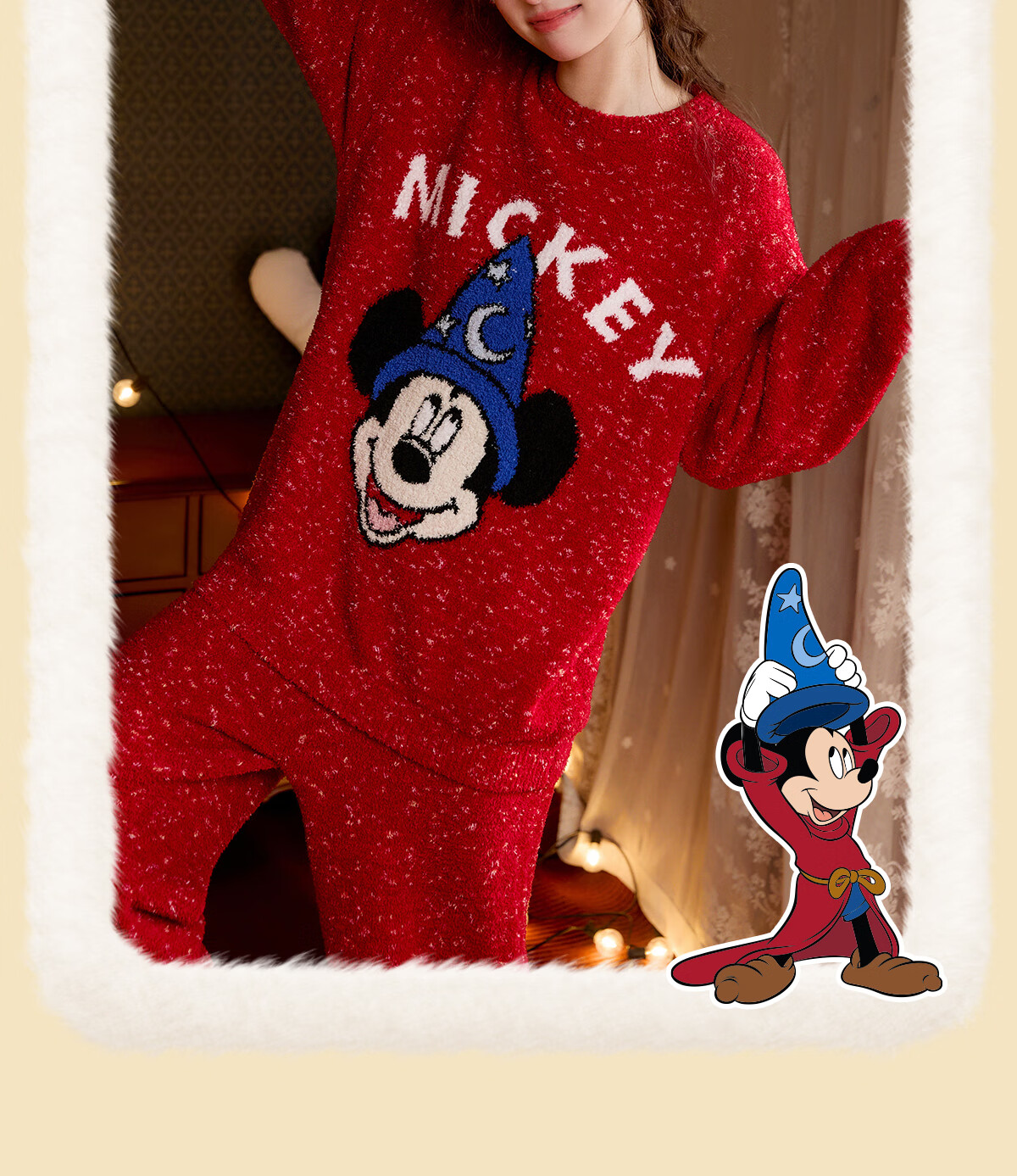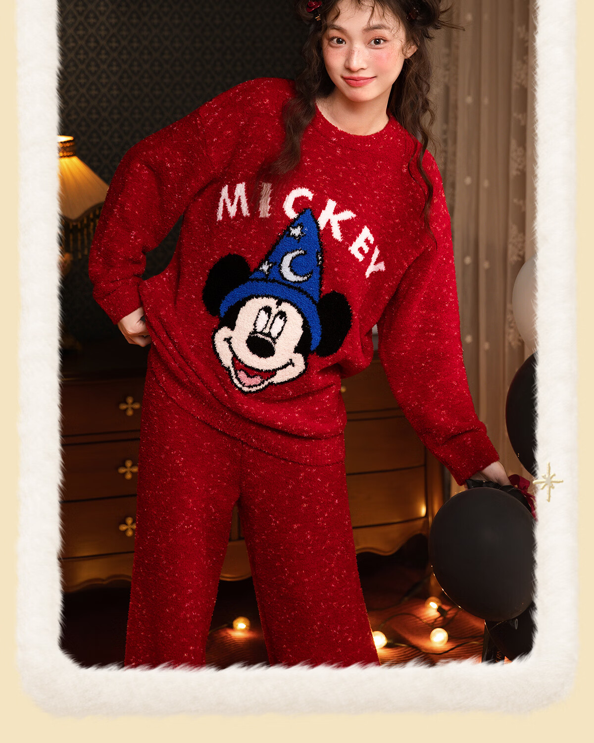 Gongdie Heat Storage Type Disney Mickey Autumn and Winter Red Couple Pajamas Women's Half Velvet Wedding Home Clothing for Men