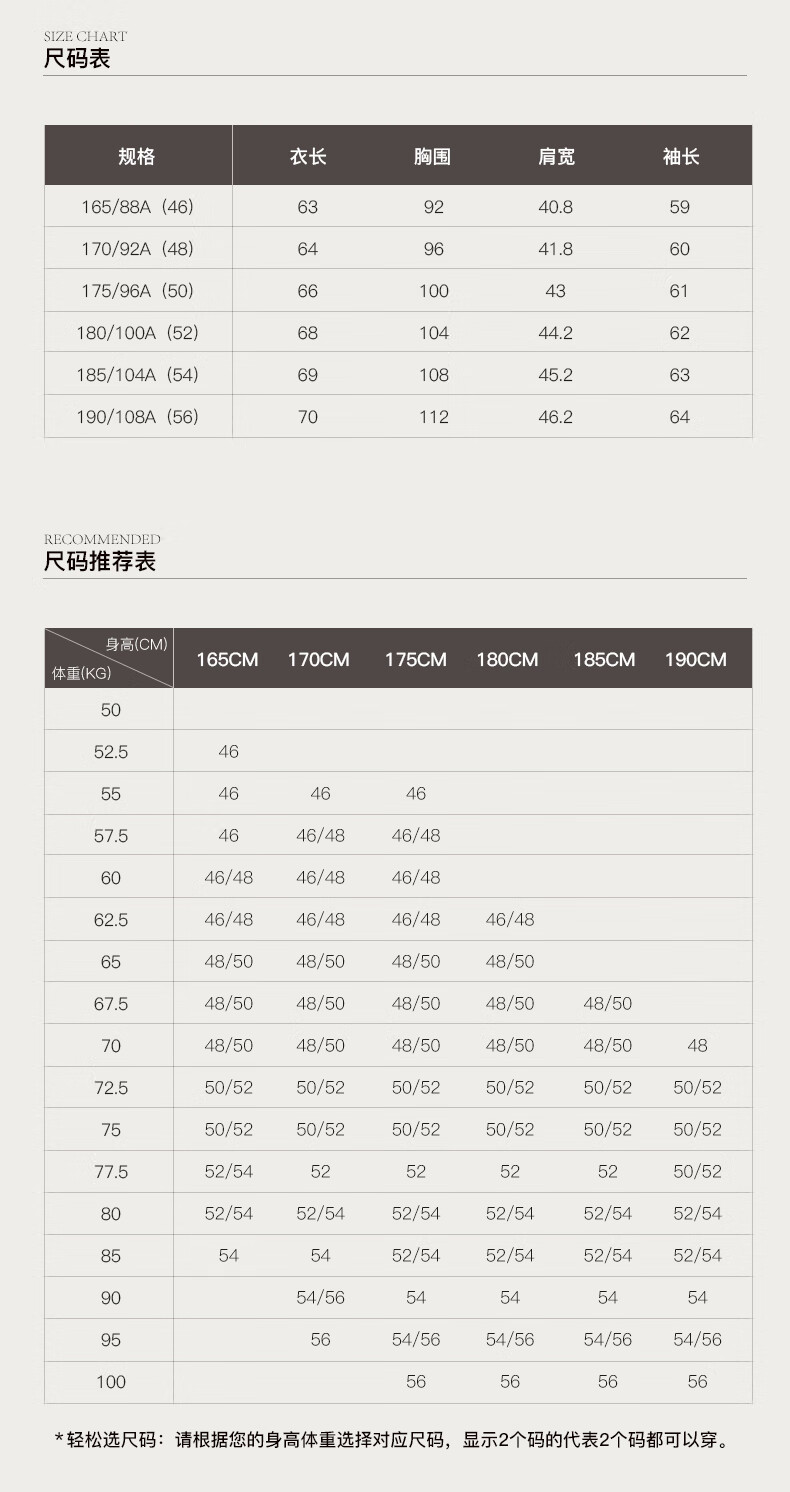 China (cm) 160-165/84-86 165-170 / 88-90 167-172 / 92-96 168-173 / 98-102 170-176 / 106-110