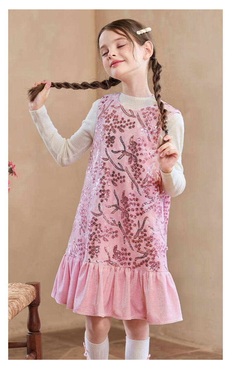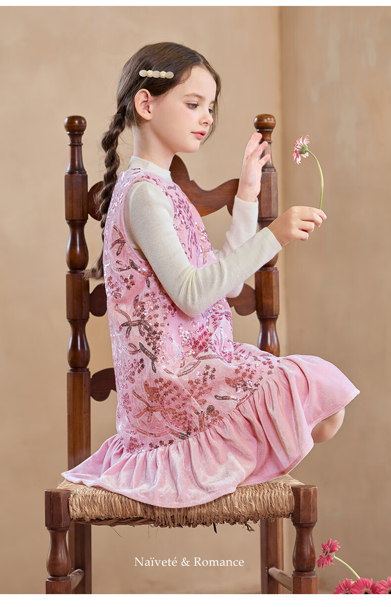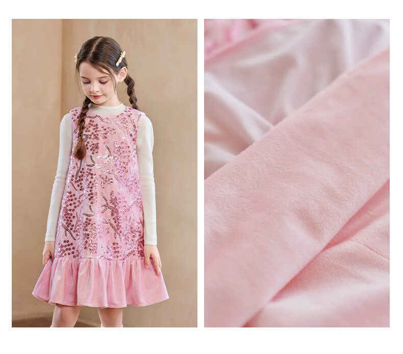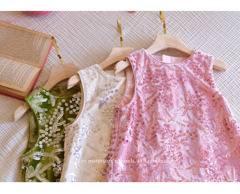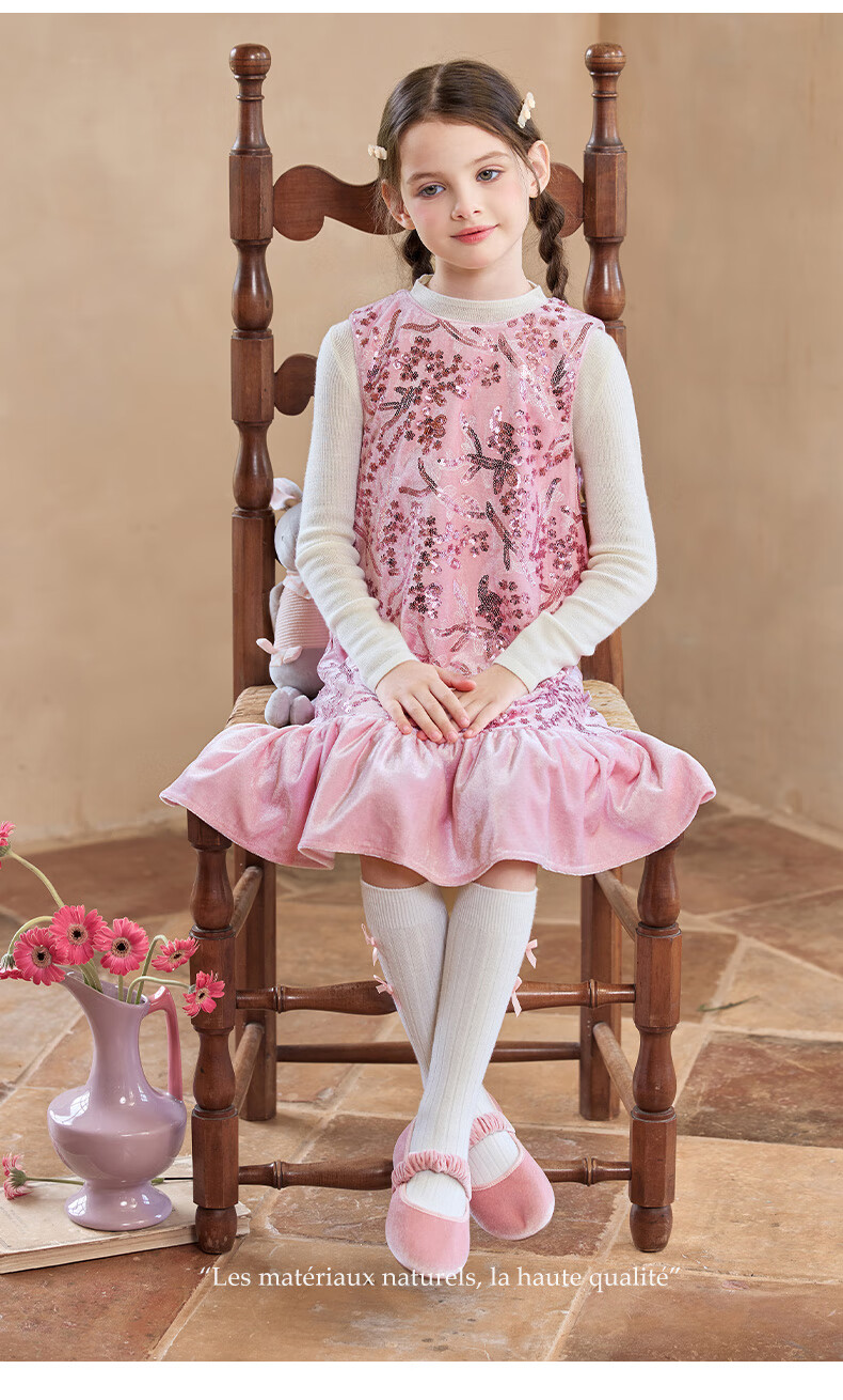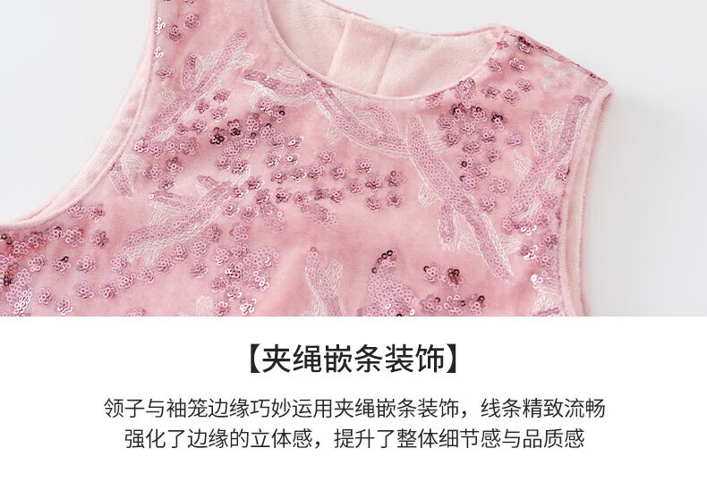 Little Naive girls heavy velvet sequin embroidered tank top winter children's velvet dress pink 150