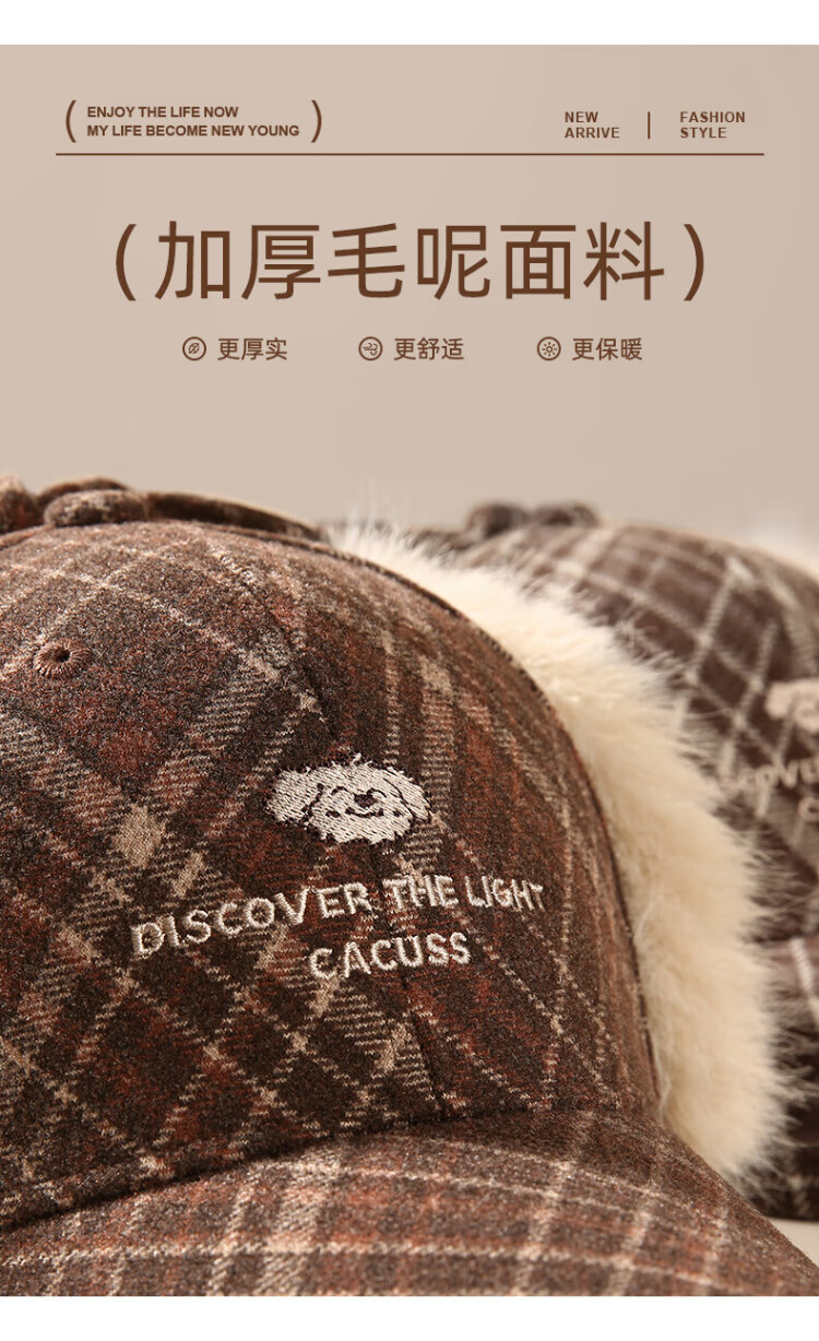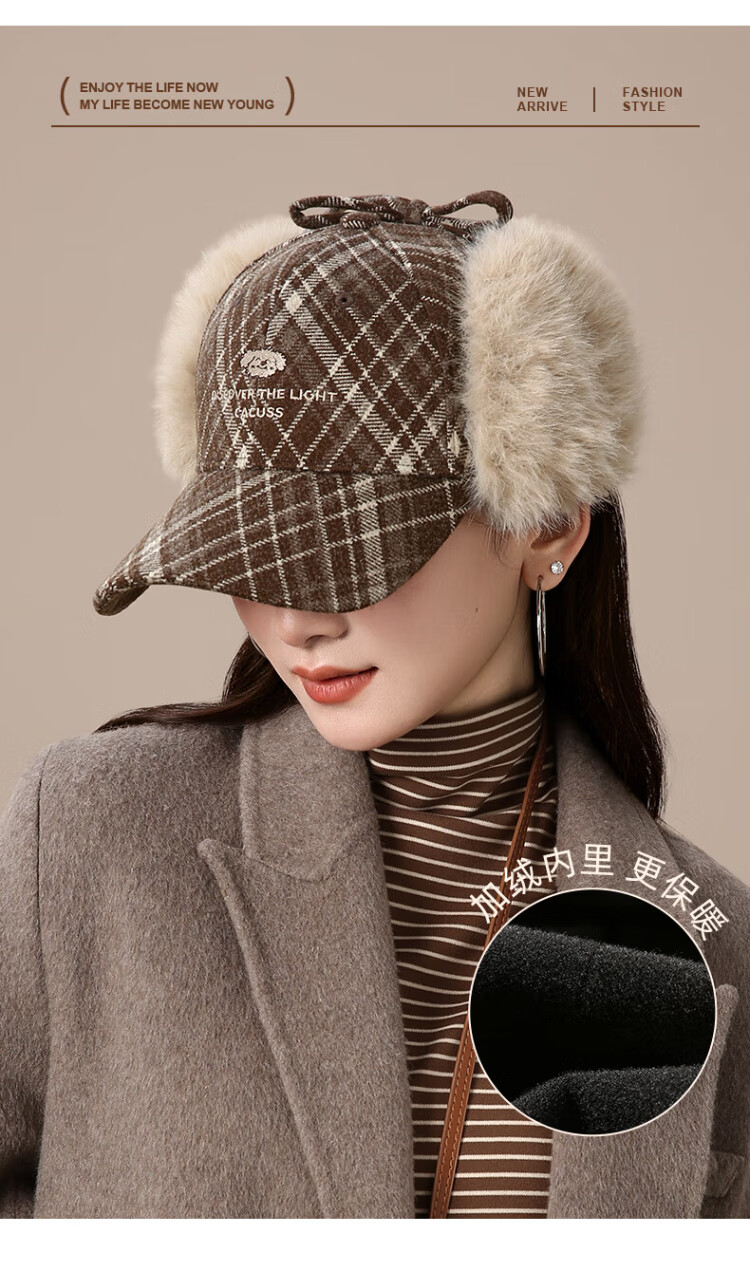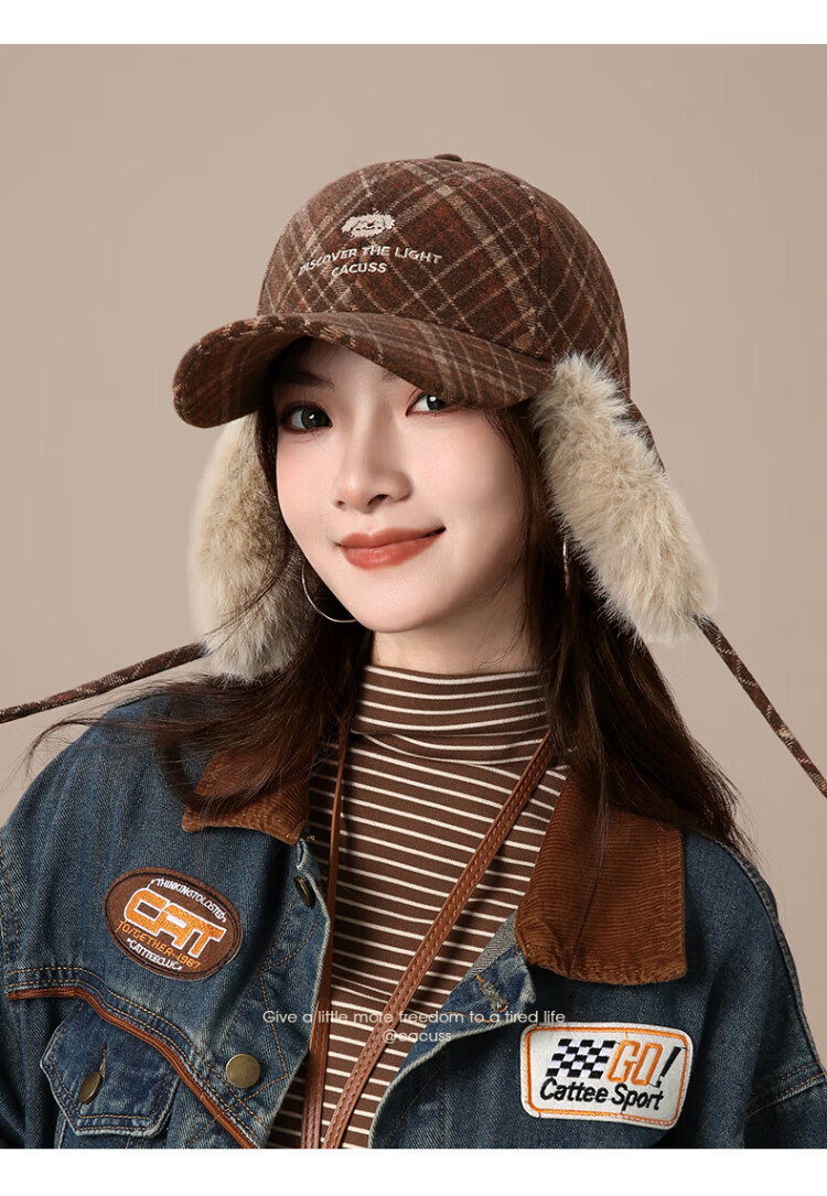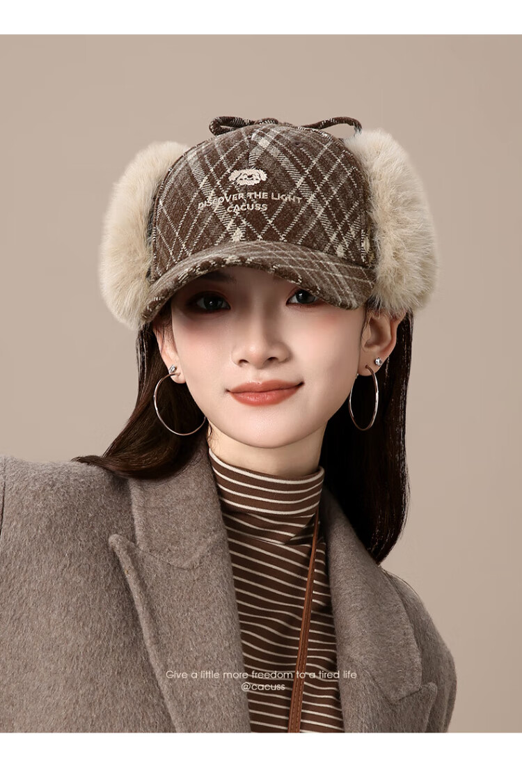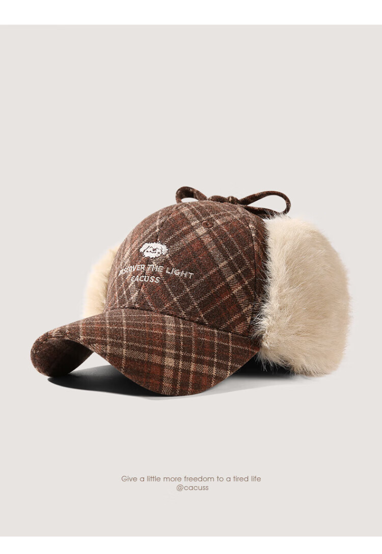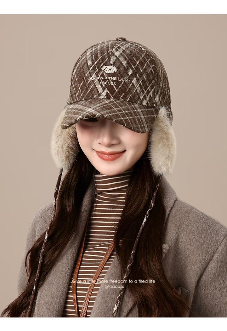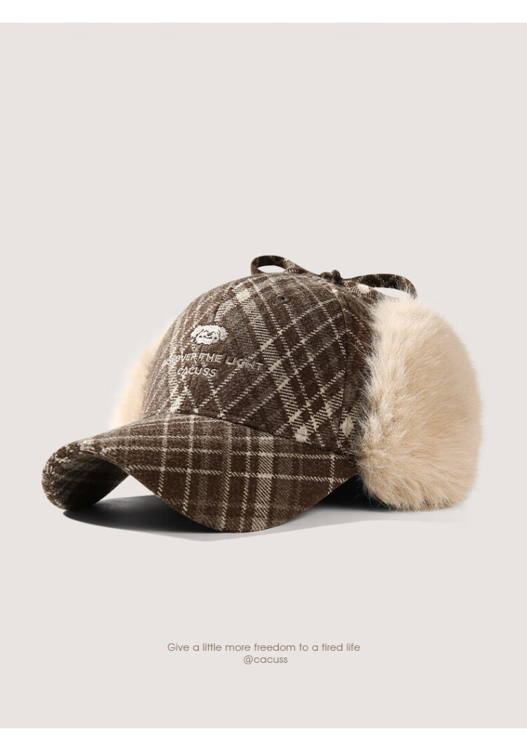 CACUSS baseball cap women's winter plaid thickened warm large head peaked cap anti-cold ear protection Lei Feng hat women