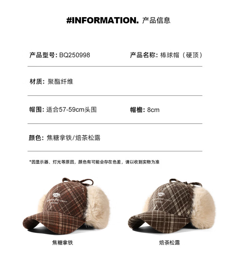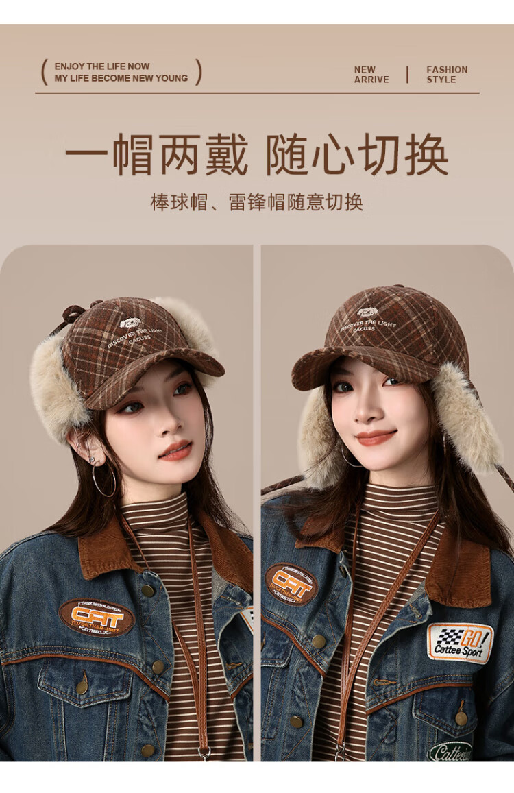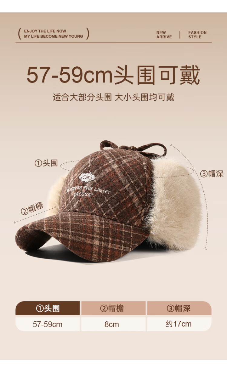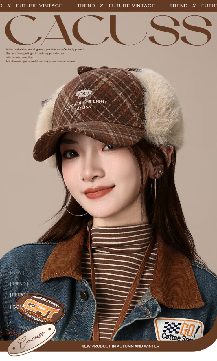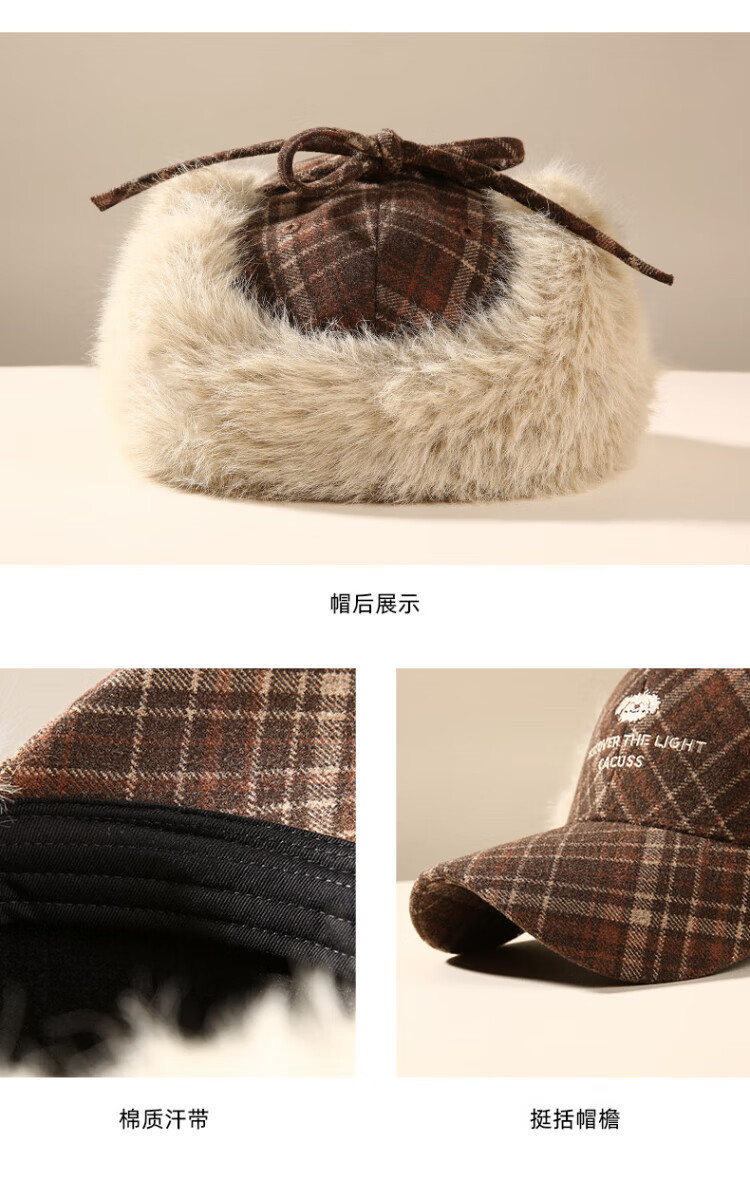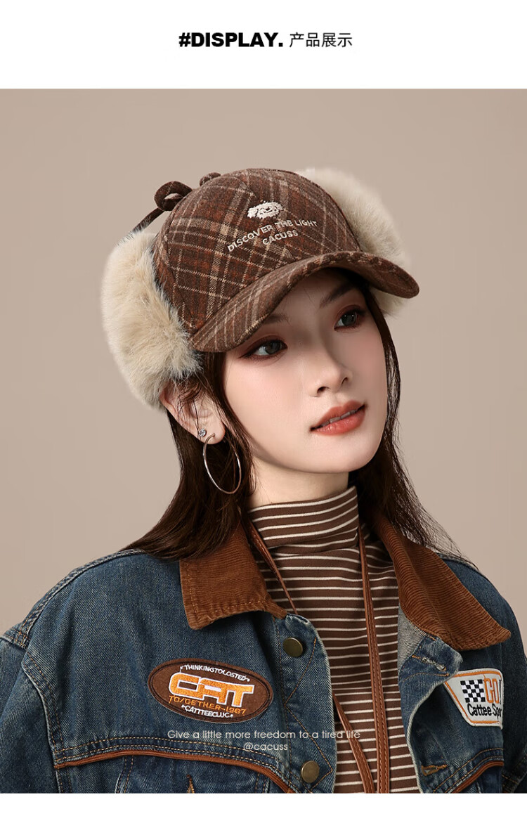 CACUSS baseball cap women's winter plaid thickened warm large head peaked cap anti-cold ear protection Lei Feng hat women