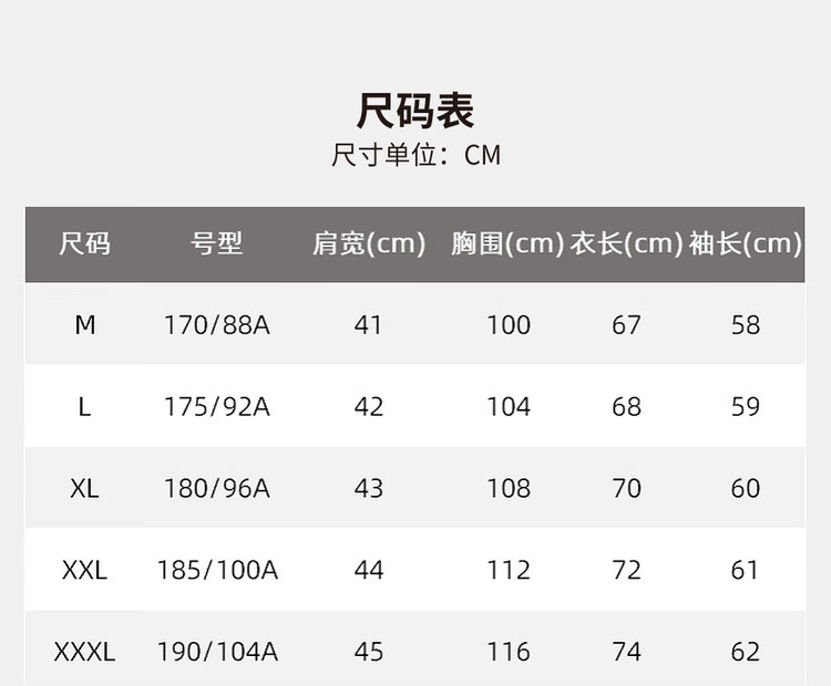 China (cm) 165 / 88-90 170 / 96-98 175 / 108-110 180 / 118-122 185 / 126-130