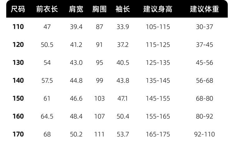 China (cm) 160-165/84-86 165-170 / 88-90 167-172 / 92-96 168-173 / 98-102 170-176 / 106-110