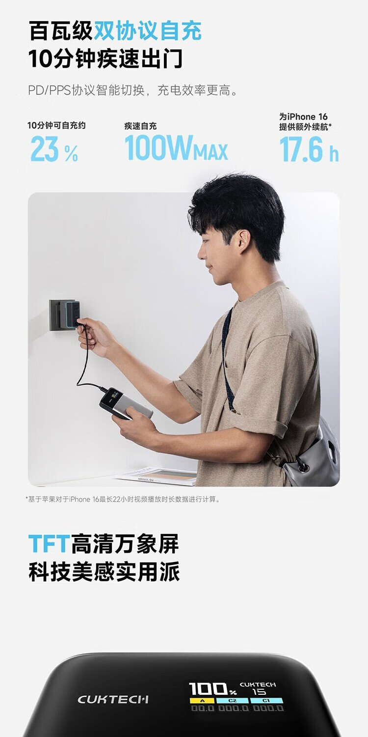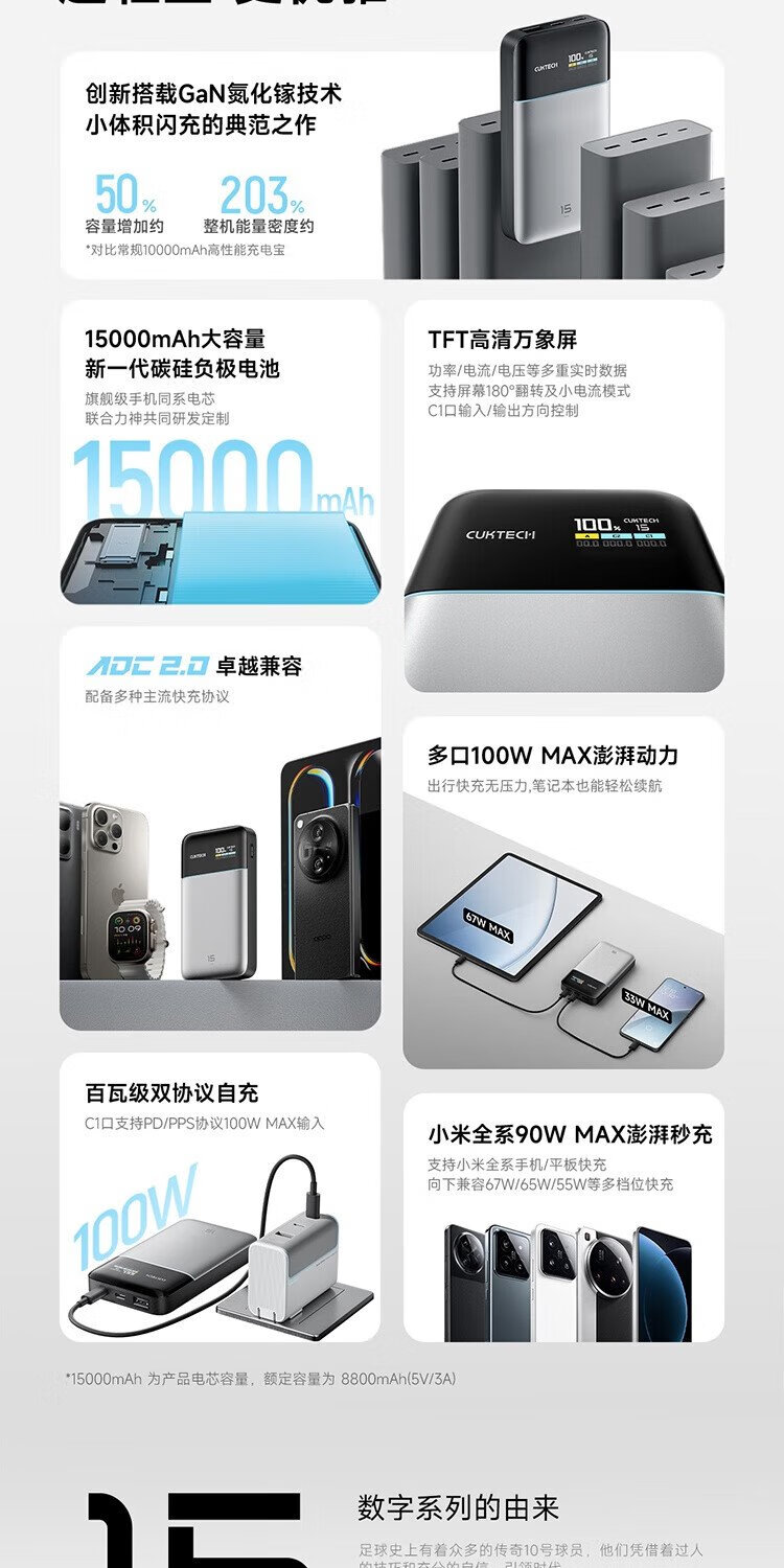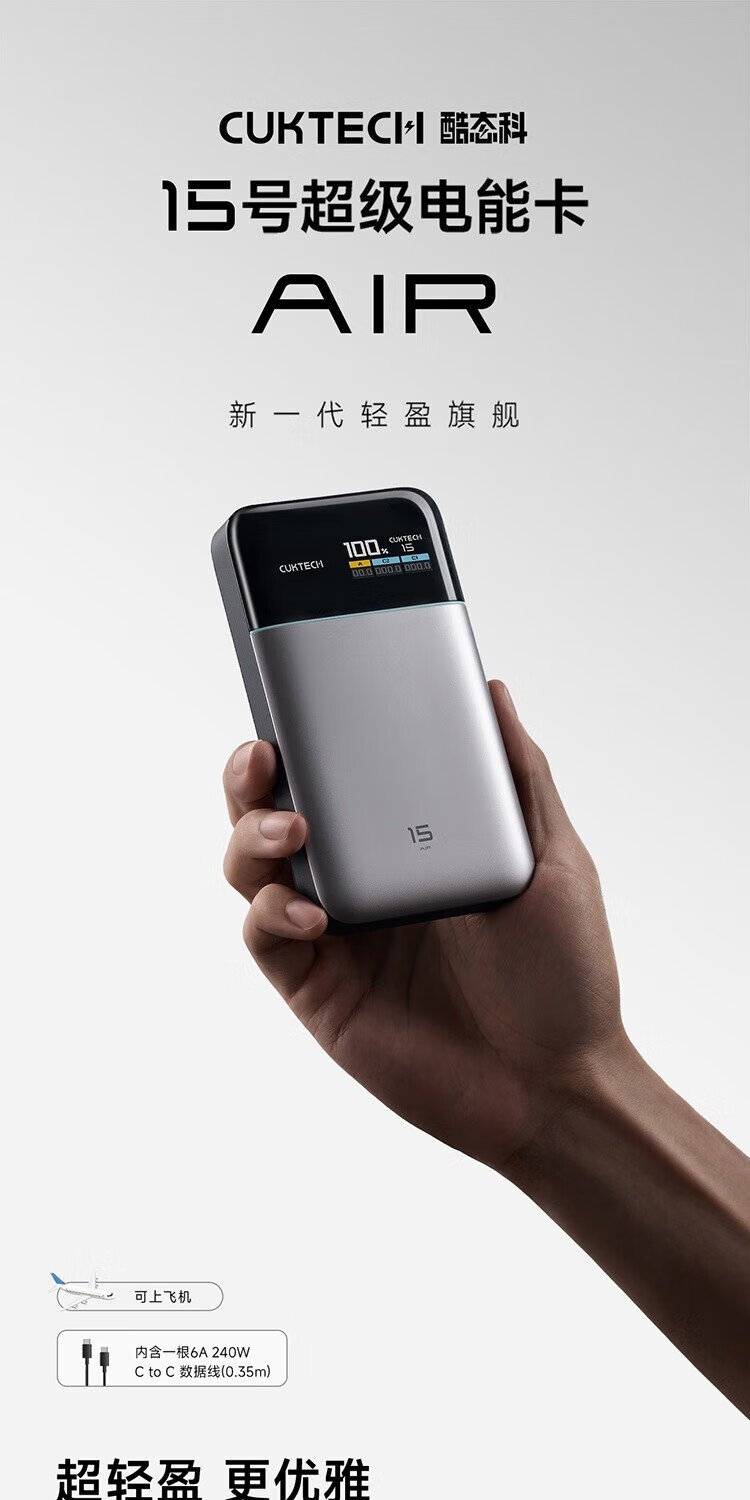 CUKTECH 3C certified for boarding aircraft No. 15 super power card Air power bank 15000 mAh multi-port 100W thin and light suitable for Apple 17 Xiaomi notebook