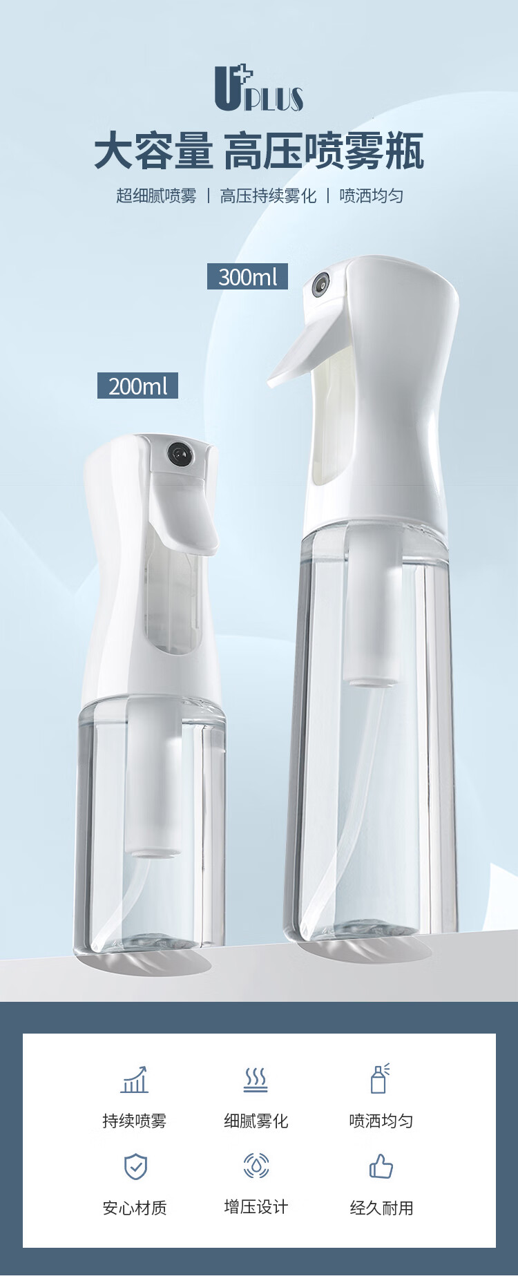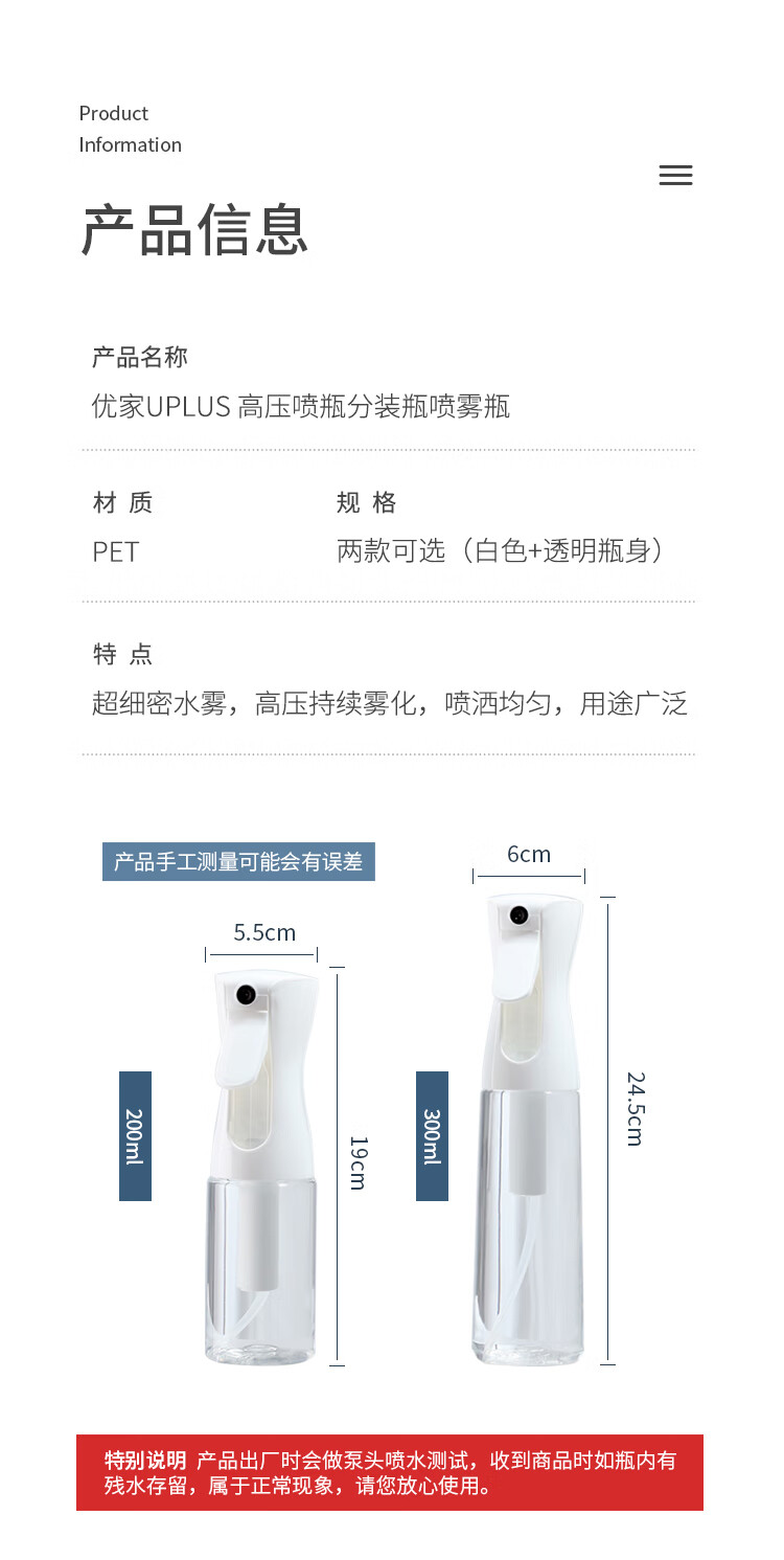 Youjia UPLUS high-pressure spray bottle refill bottle spray bottle large capacity 300ml transparent ultra-fine mist alcohol spray bottle empty bottle