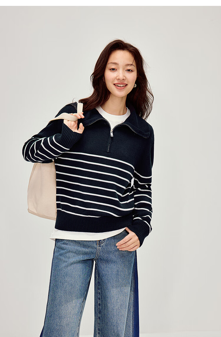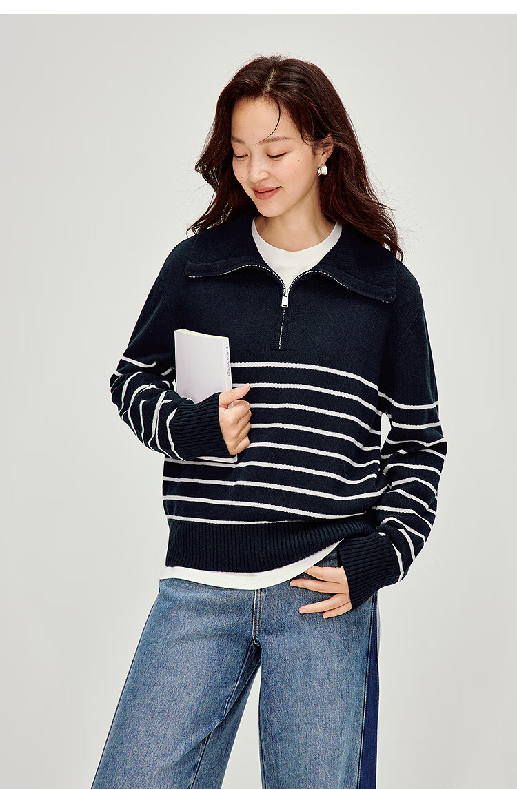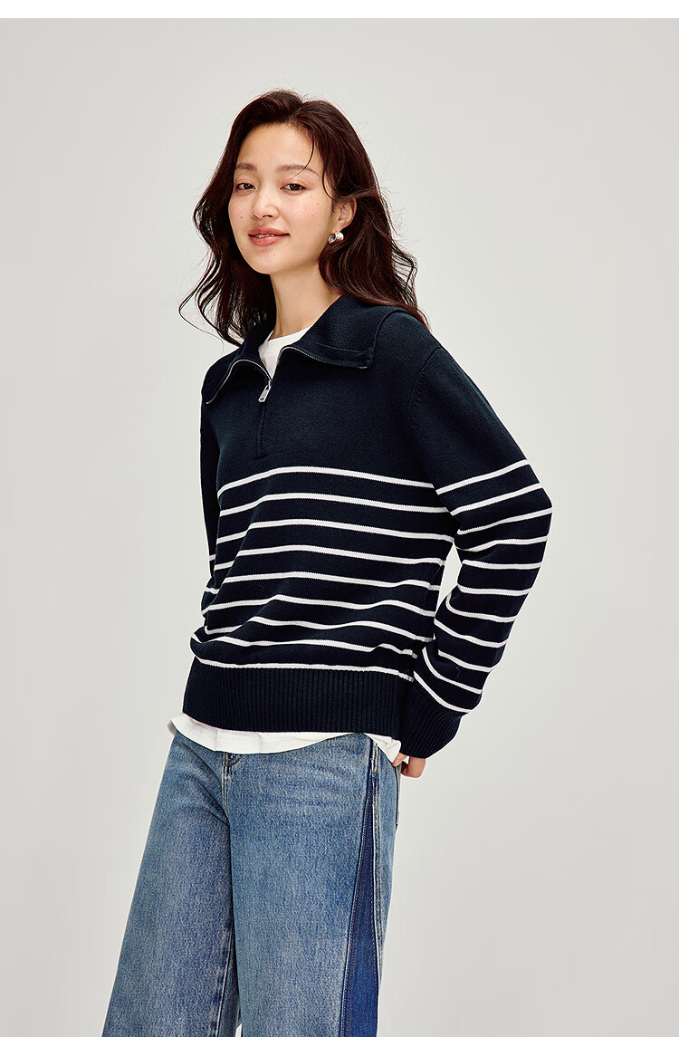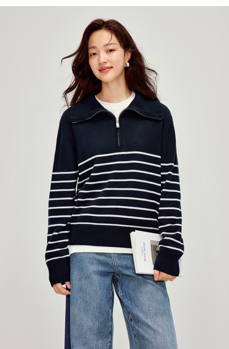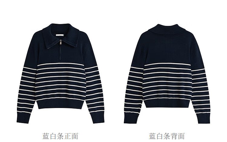 INMAN Retro Striped Large Lapel Zipper Sweater 2026 Spring Women's New Simple Knitted Sweater Blue and White Stripes S