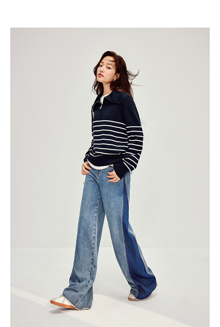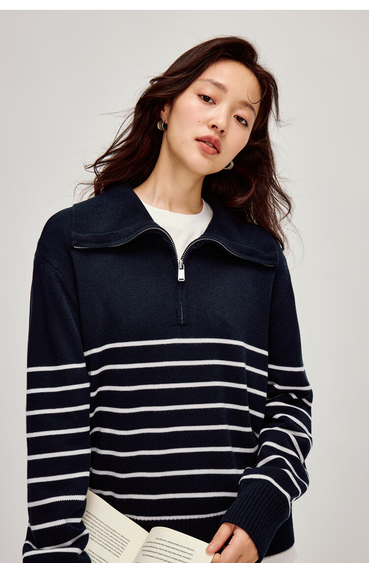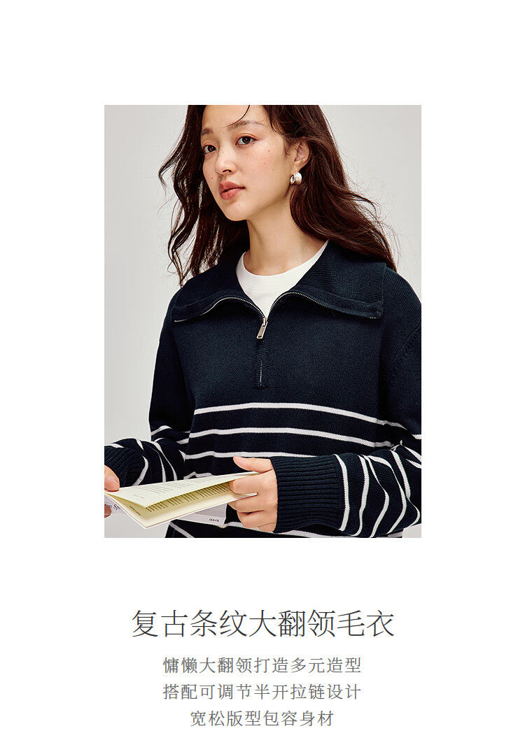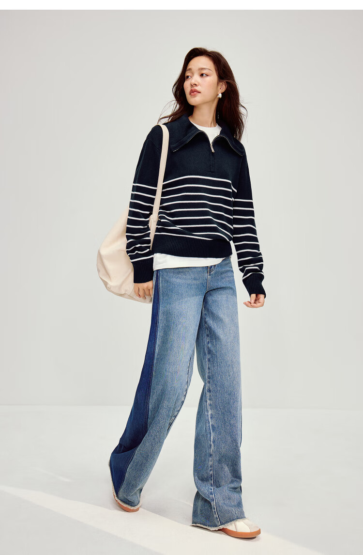 INMAN Retro Striped Large Lapel Zipper Sweater 2026 Spring Women's New Simple Knitted Sweater Blue and White Stripes S