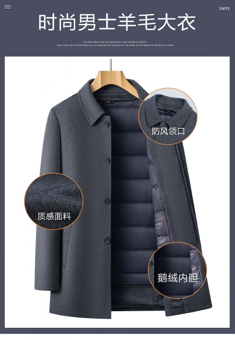 Hengyuanxiang cashmere coat men's medium-length wool woolen thickened dad winter coat with down lining for middle-aged and elderly people