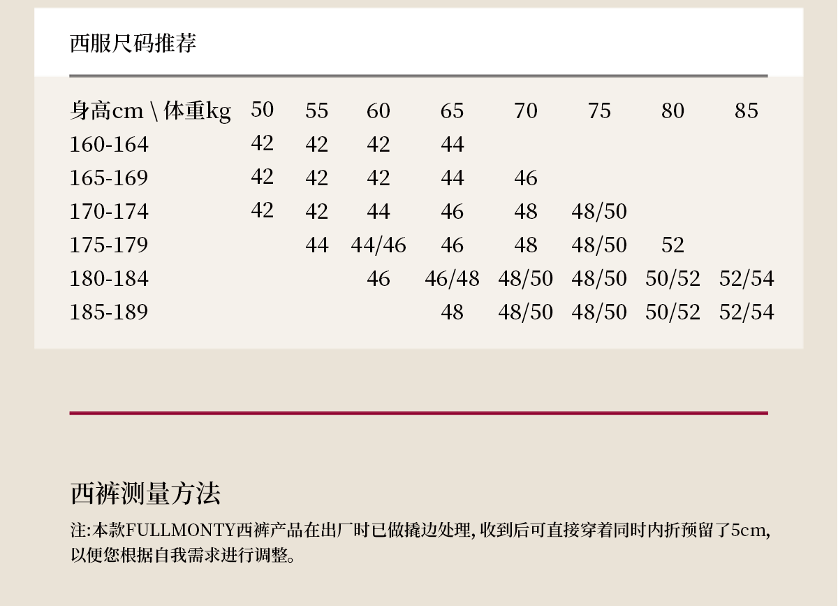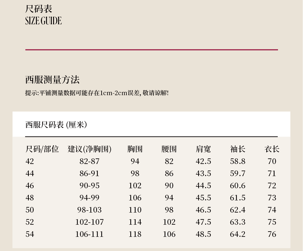 China (cm) 165 / 88-90 170 / 96-98 175 / 108-110 180 / 118-122 185 / 126-130