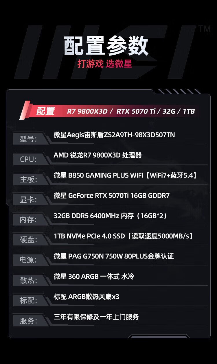 MSI Family Bucket Aegis ZS2 AMD Ryzen R7 9800X3D/RTX5070Ti/32G D5/1T water-cooled e-sports gaming desktop computer host complete machine national subsidy