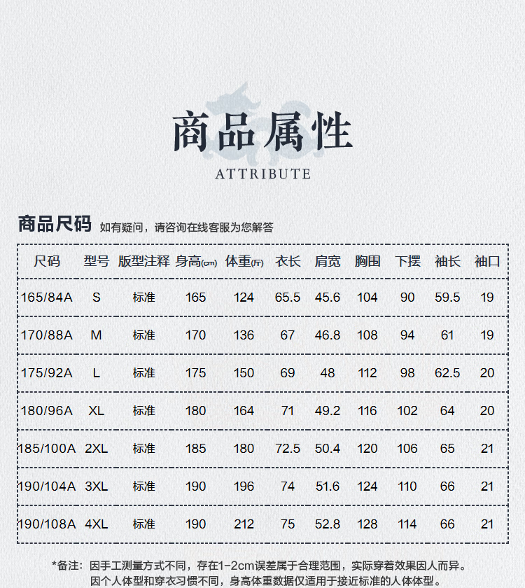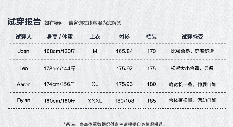 China (cm) 165 / 88-90 170 / 96-98 175 / 108-110 180 / 118-122 185 / 126-130