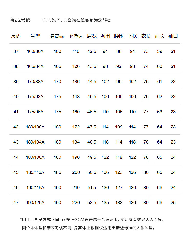 China (cm) 160-165/84-86 165-170 / 88-90 167-172 / 92-96 168-173 / 98-102 170-176 / 106-110