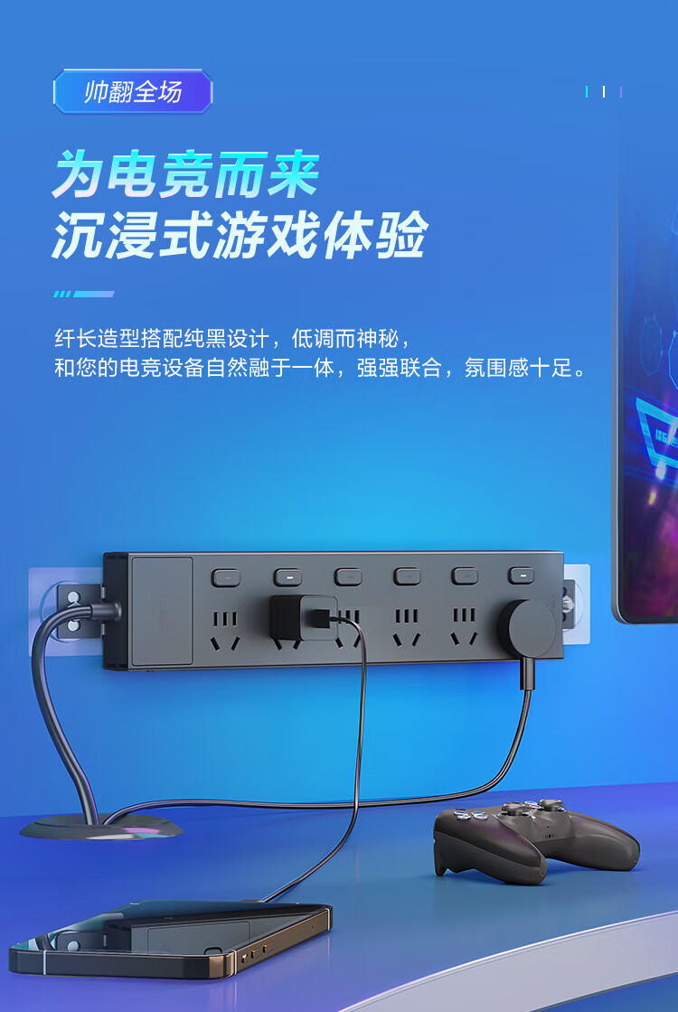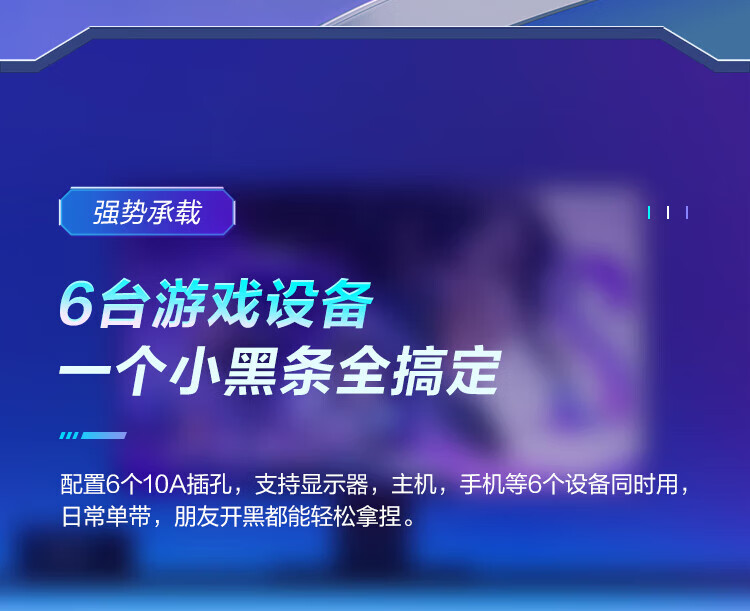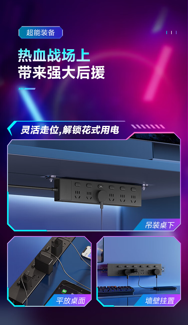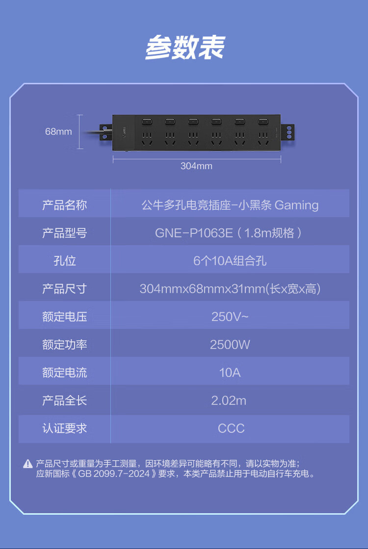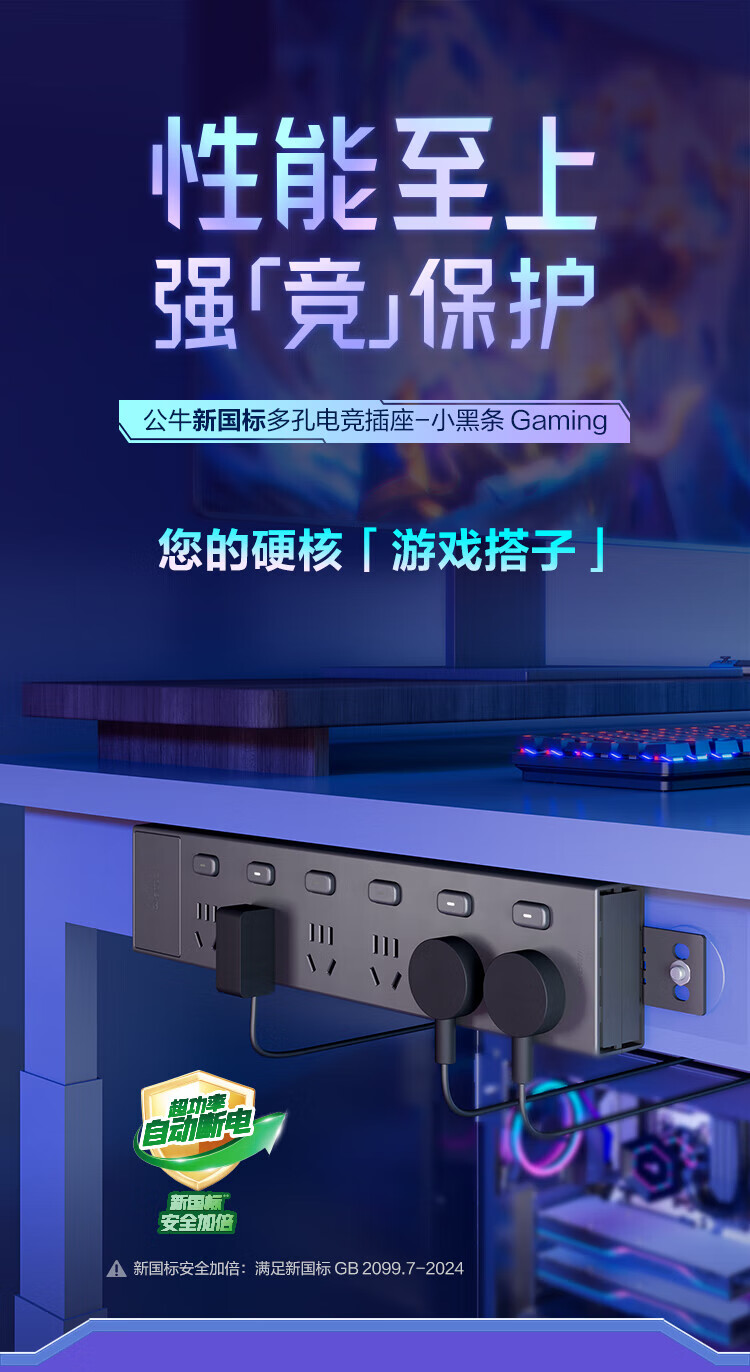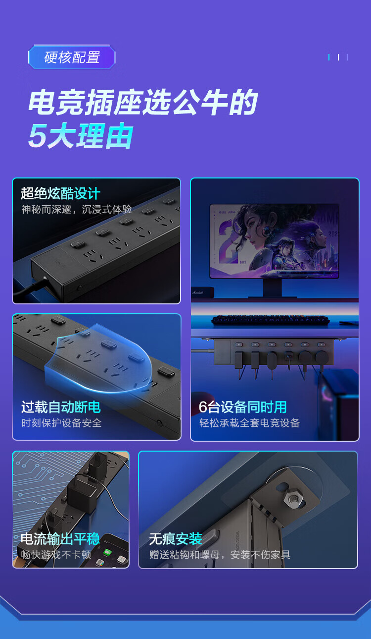 公牛(BULL)PDU桌面过载超功率保护桌下电竞机柜插座/插线板/插排/排插 6位分控 1.8米规格 GNE-P1063E黑