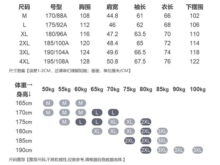China (cm) 165 / 88-90 170 / 96-98 175 / 108-110 180 / 118-122 185 / 126-130