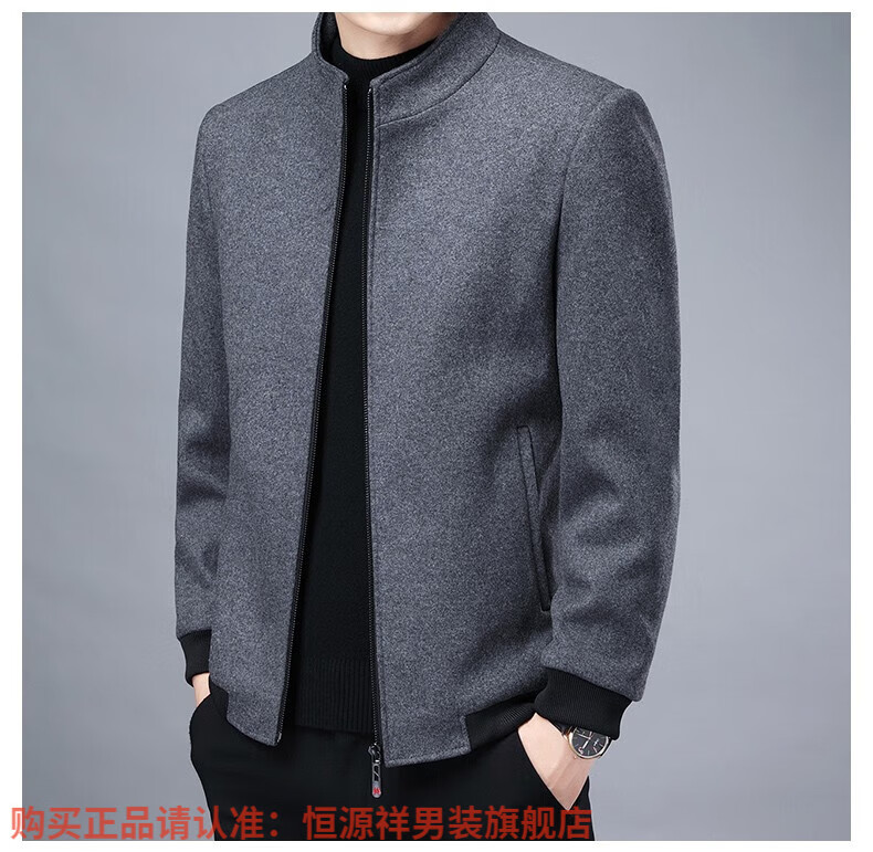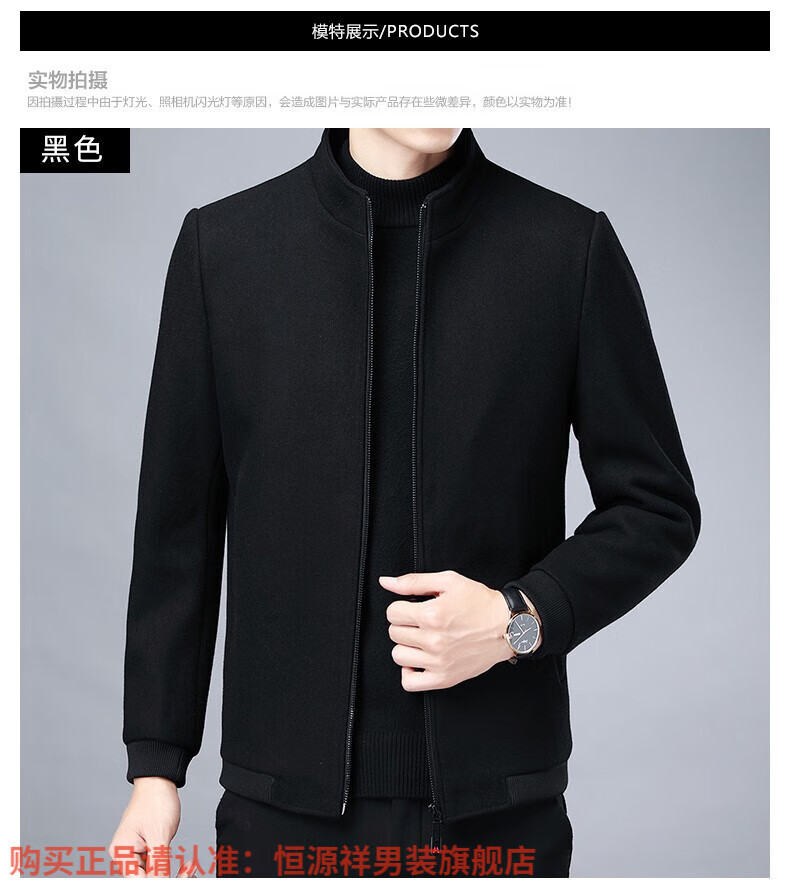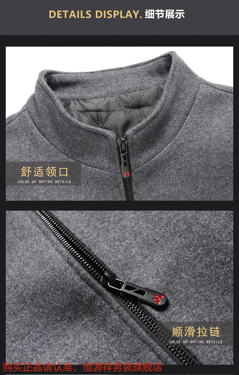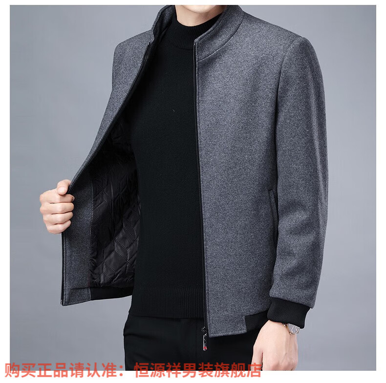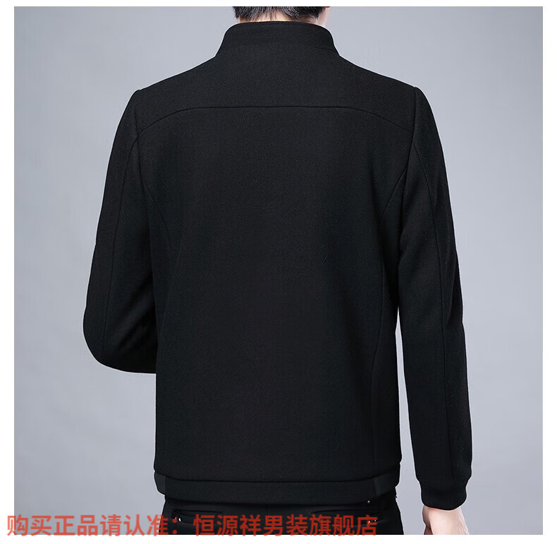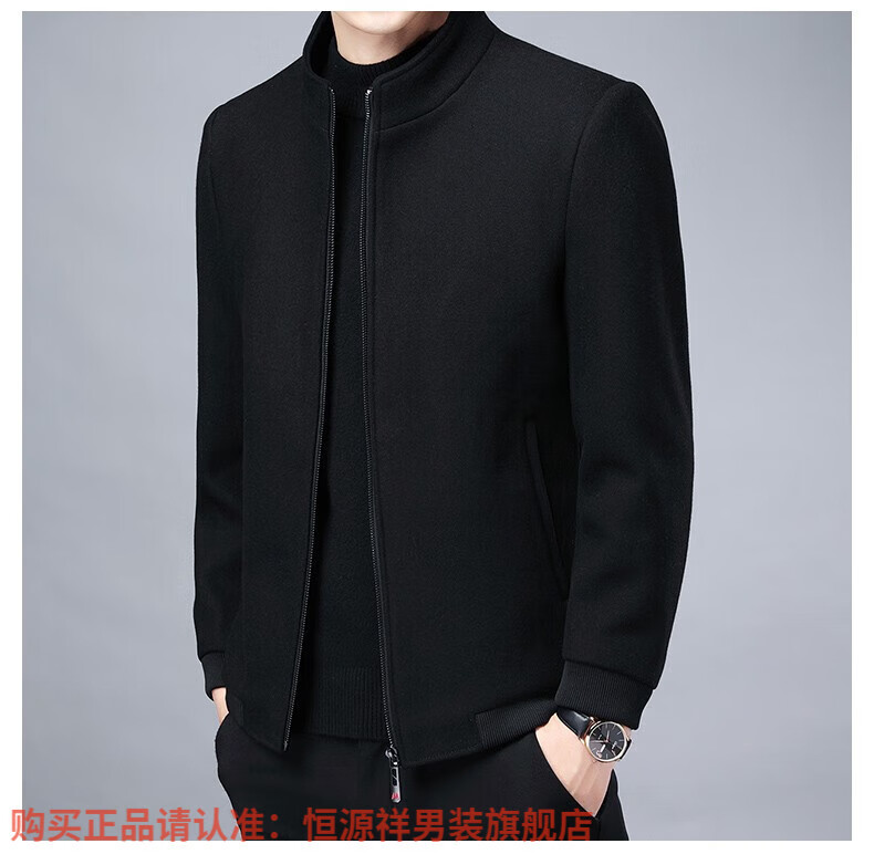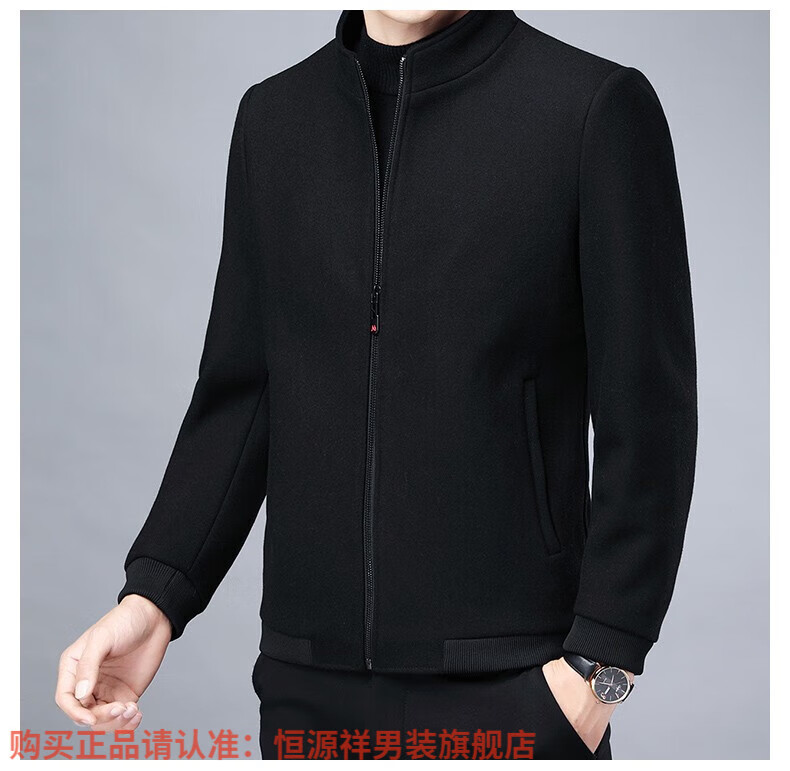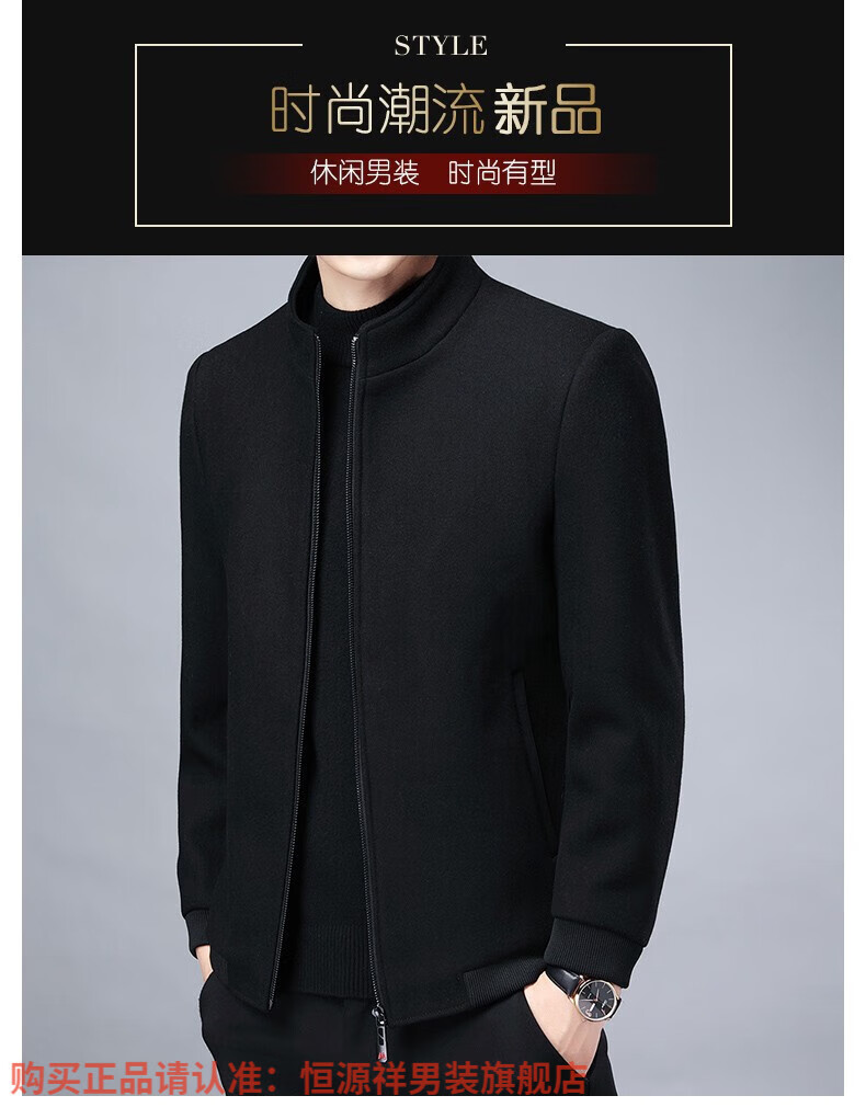 Hengyuanxiang men's wool jacket autumn and winter stand collar fashion jacket casual tops men's middle-aged dad woolen jacket black XL 180