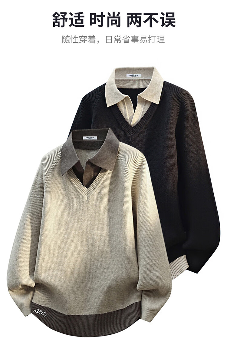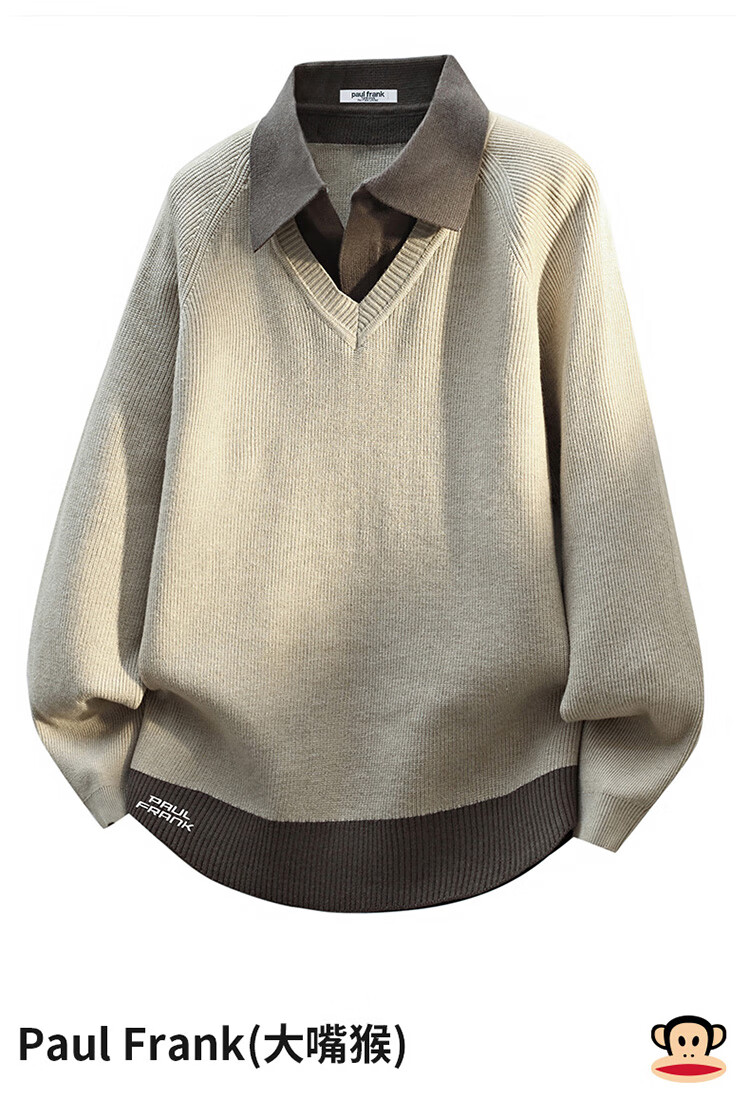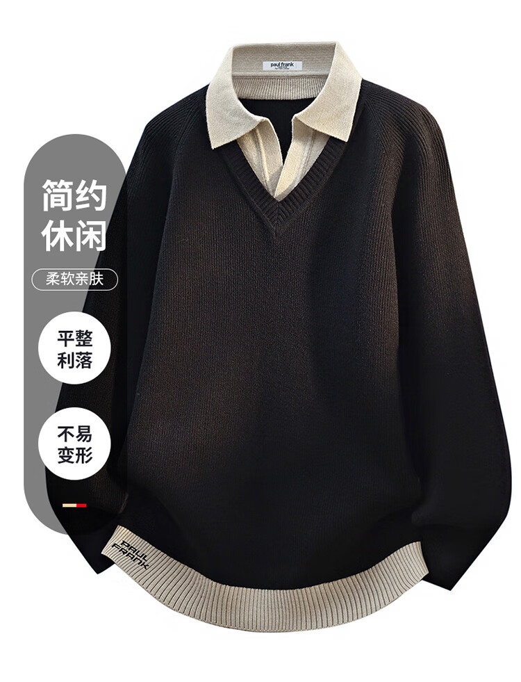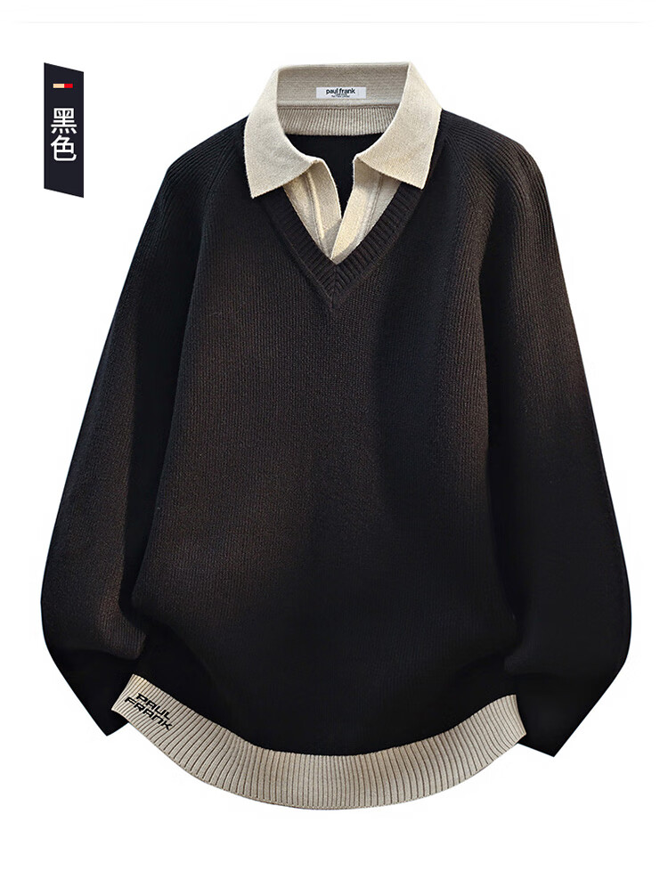 Big mouth monkey (paul frank) sweater men's winter fake two-piece knitted sweater men's warm base shirt top woolen clothes black XL