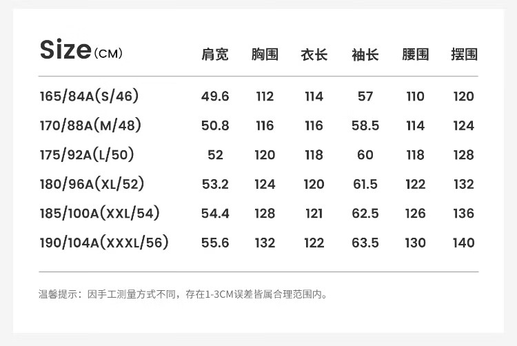 China (cm) 165 / 88-90 170 / 96-98 175 / 108-110 180 / 118-122 185 / 126-130