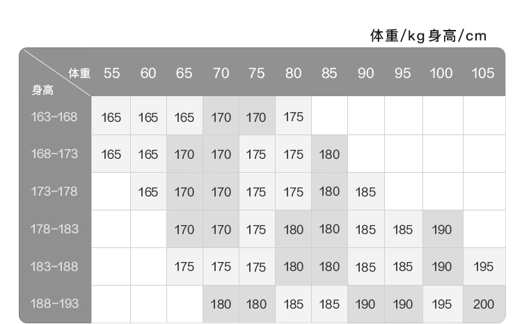 China (cm) 160-165/84-86 165-170 / 88-90 167-172 / 92-96 168-173 / 98-102 170-176 / 106-110