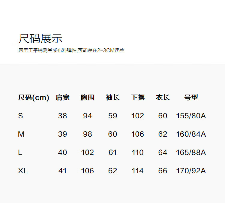 China (cm) 160-165/84-86 165-170 / 88-90 167-172 / 92-96 168-173 / 98-102 170-176 / 106-110