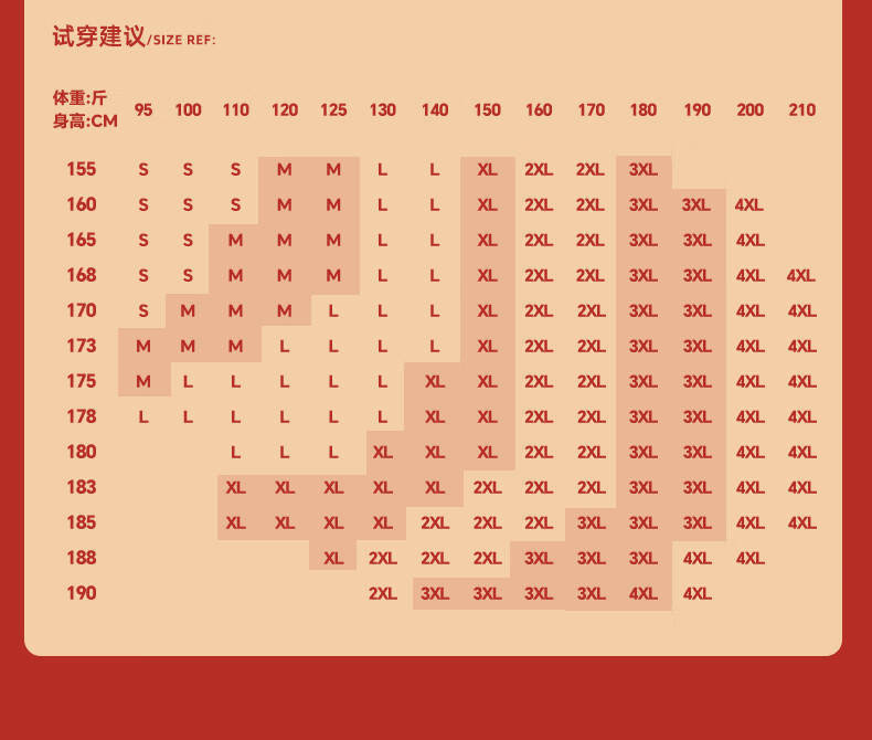 China (cm) 160-165/84-86 165-170 / 88-90 167-172 / 92-96 168-173 / 98-102 170-176 / 106-110