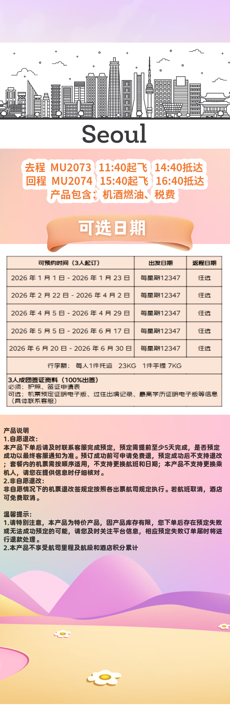 Jingdong Travel Seoul Air Ticket + Visa Package Departs from February 19 (the third day of the Lunar New Year) to February 22 (the sixth day of the Lunar New Year) during the day shift without staying up late. Infrastructure fuel and taxes are included. Single price