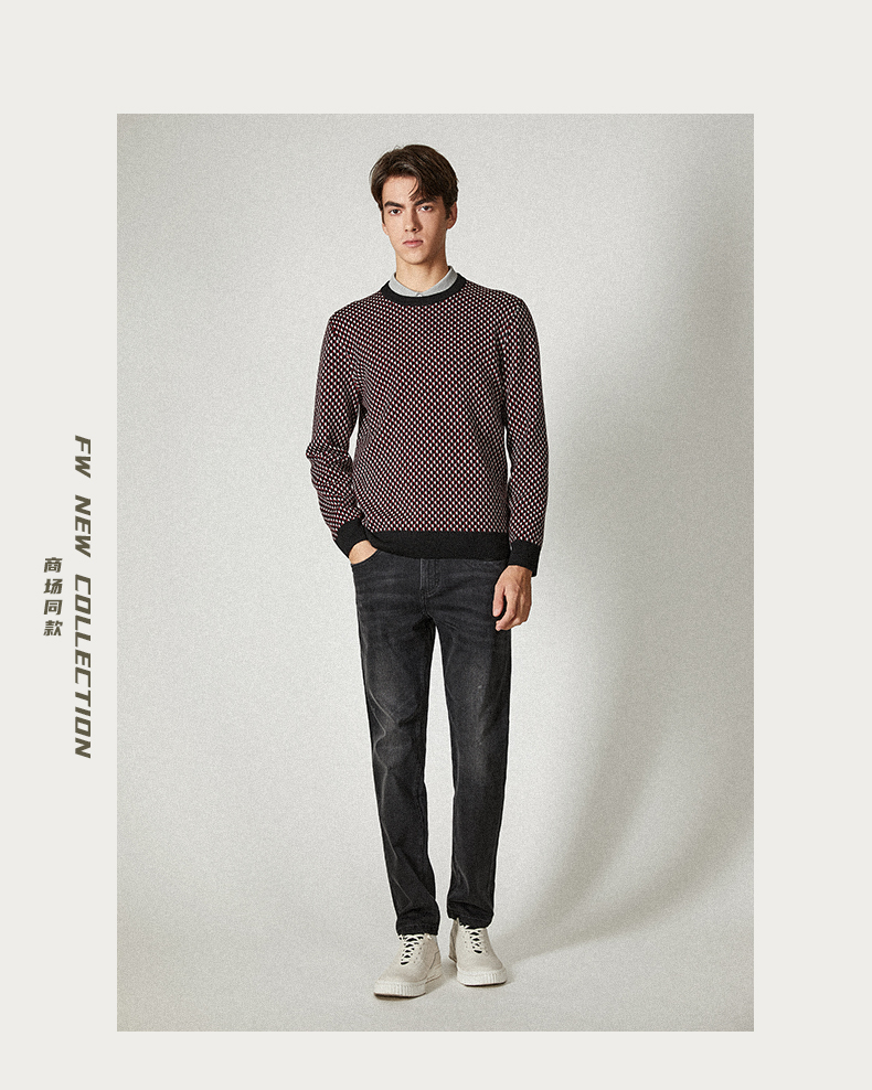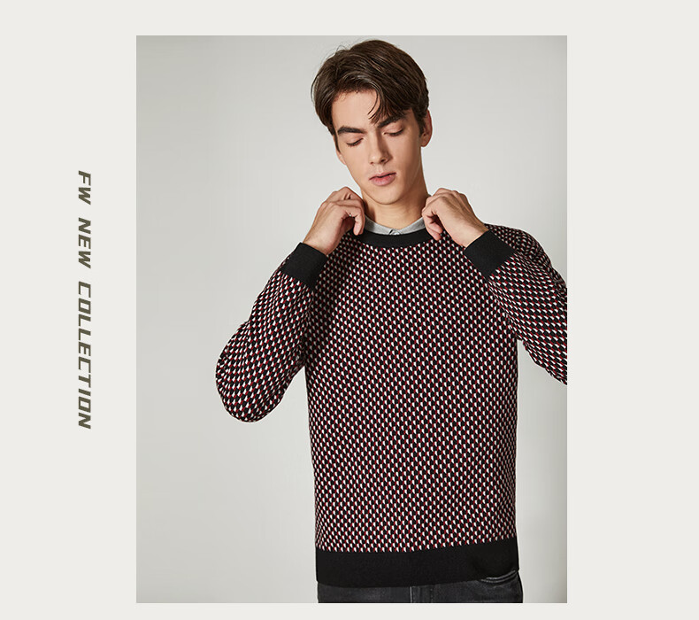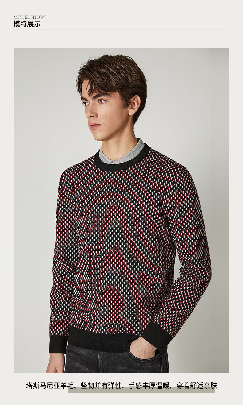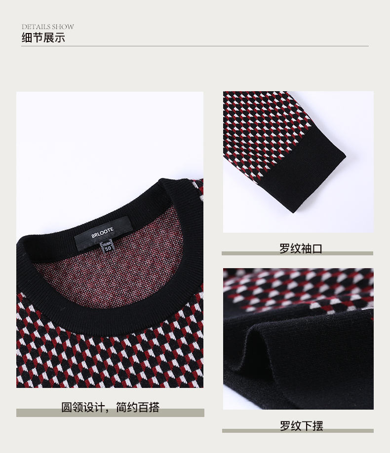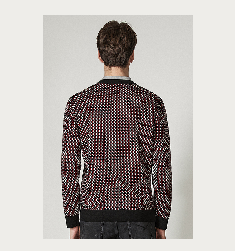 Brloote jacquard wool sweater for men, diamond plaid sheep wool warm sweater for winter, black and red 170/92A
