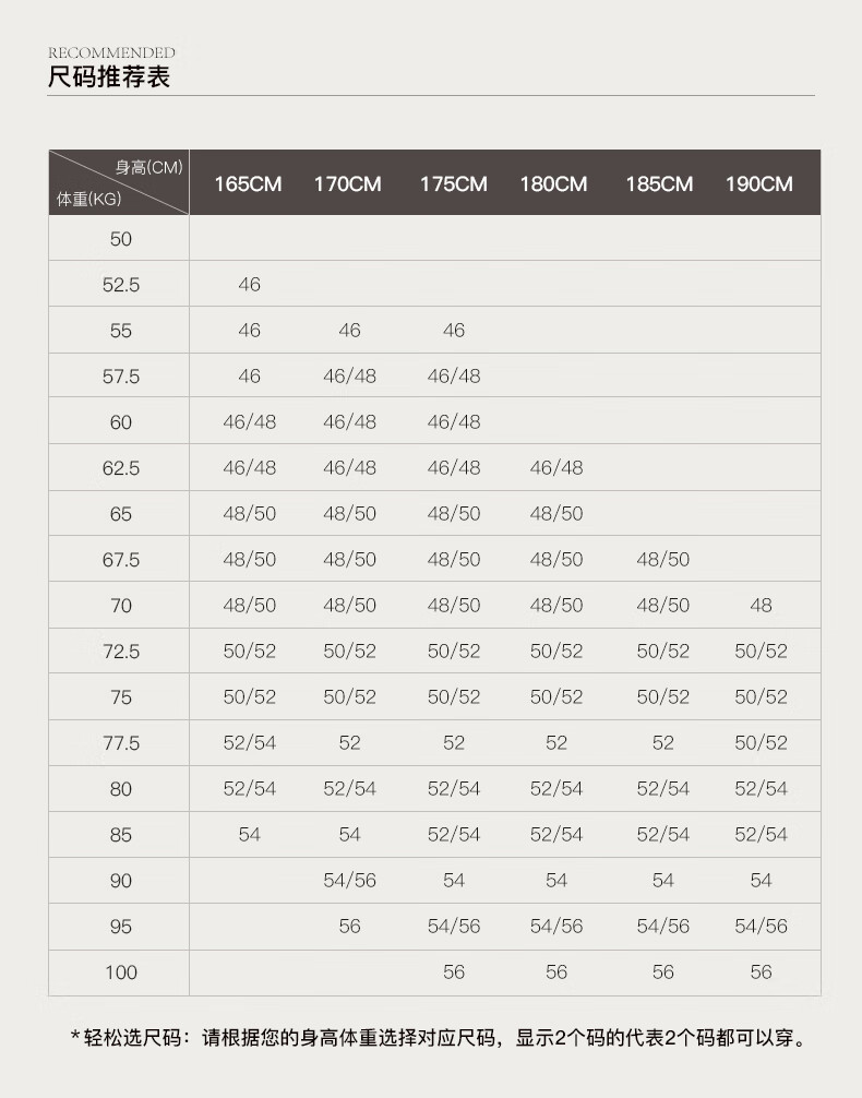 China (cm) 160-165/84-86 165-170 / 88-90 167-172 / 92-96 168-173 / 98-102 170-176 / 106-110