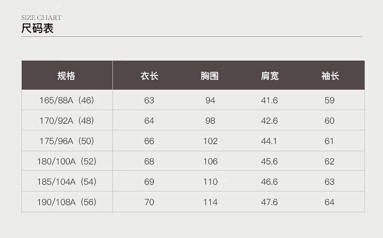 China (cm) 165 / 88-90 170 / 96-98 175 / 108-110 180 / 118-122 185 / 126-130