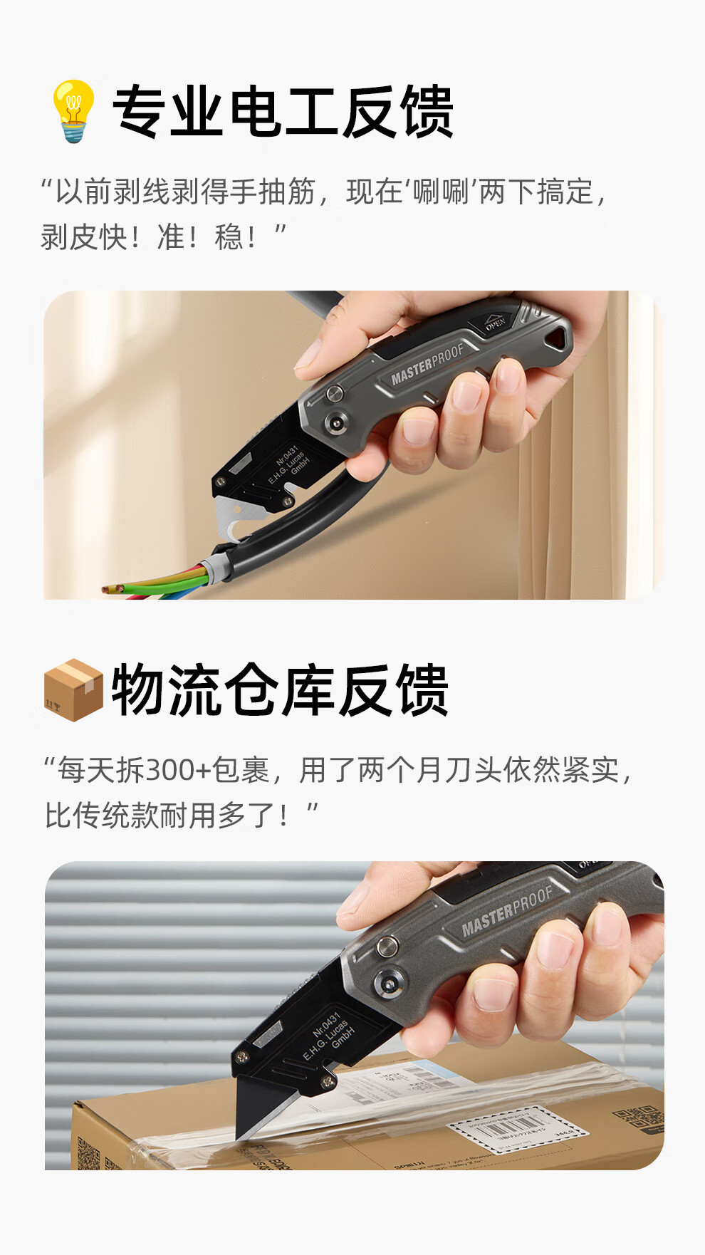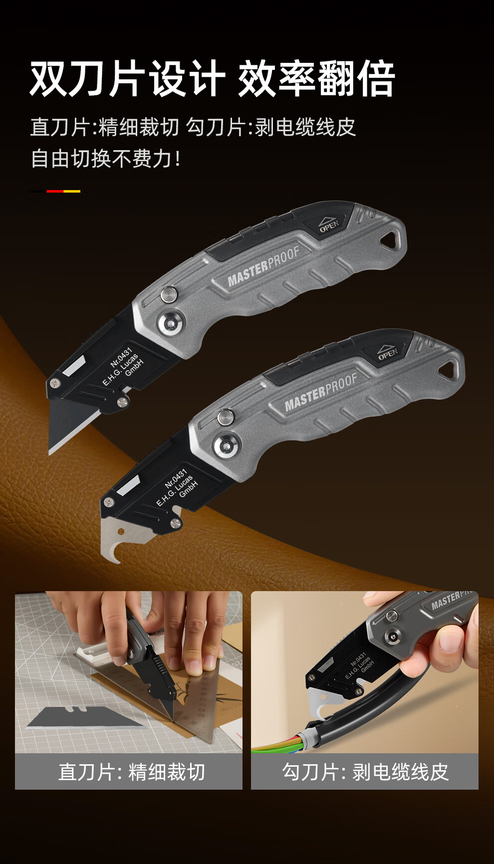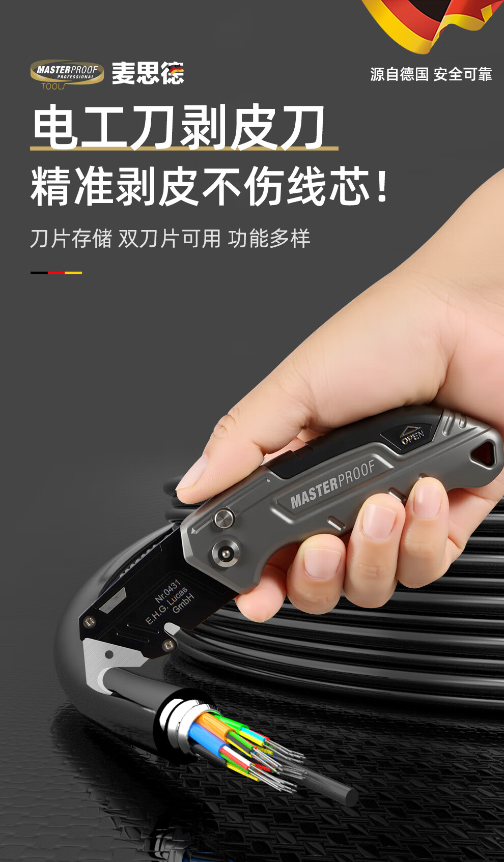 MASTERPROOF special electrician's knife for cable stripping, heavy-duty utility knife, cable stripping knife, straight-edged electrician's knife, curved blade cutting knife, hook knife