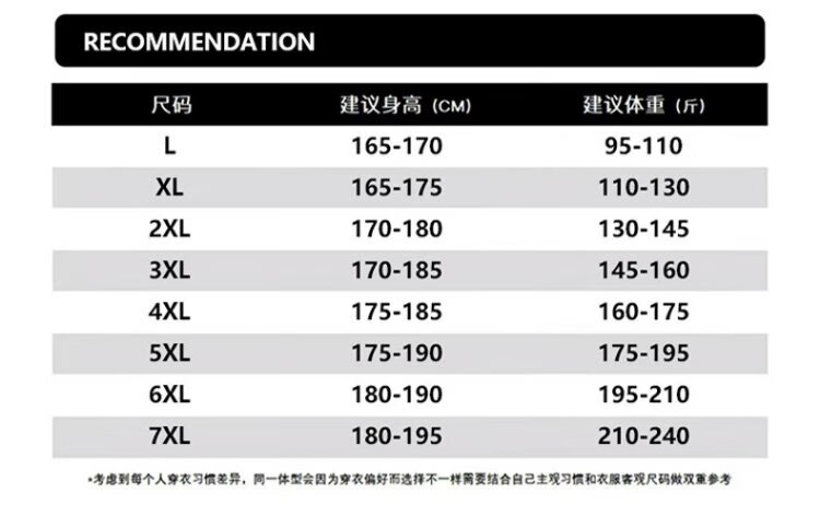 China (cm) 165 / 88-90 170 / 96-98 175 / 108-110 180 / 118-122 185 / 126-130