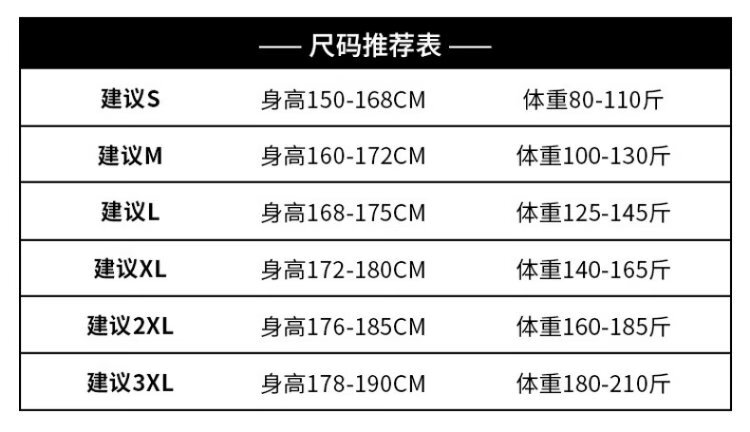 China (cm) 165 / 88-90 170 / 96-98 175 / 108-110 180 / 118-122 185 / 126-130